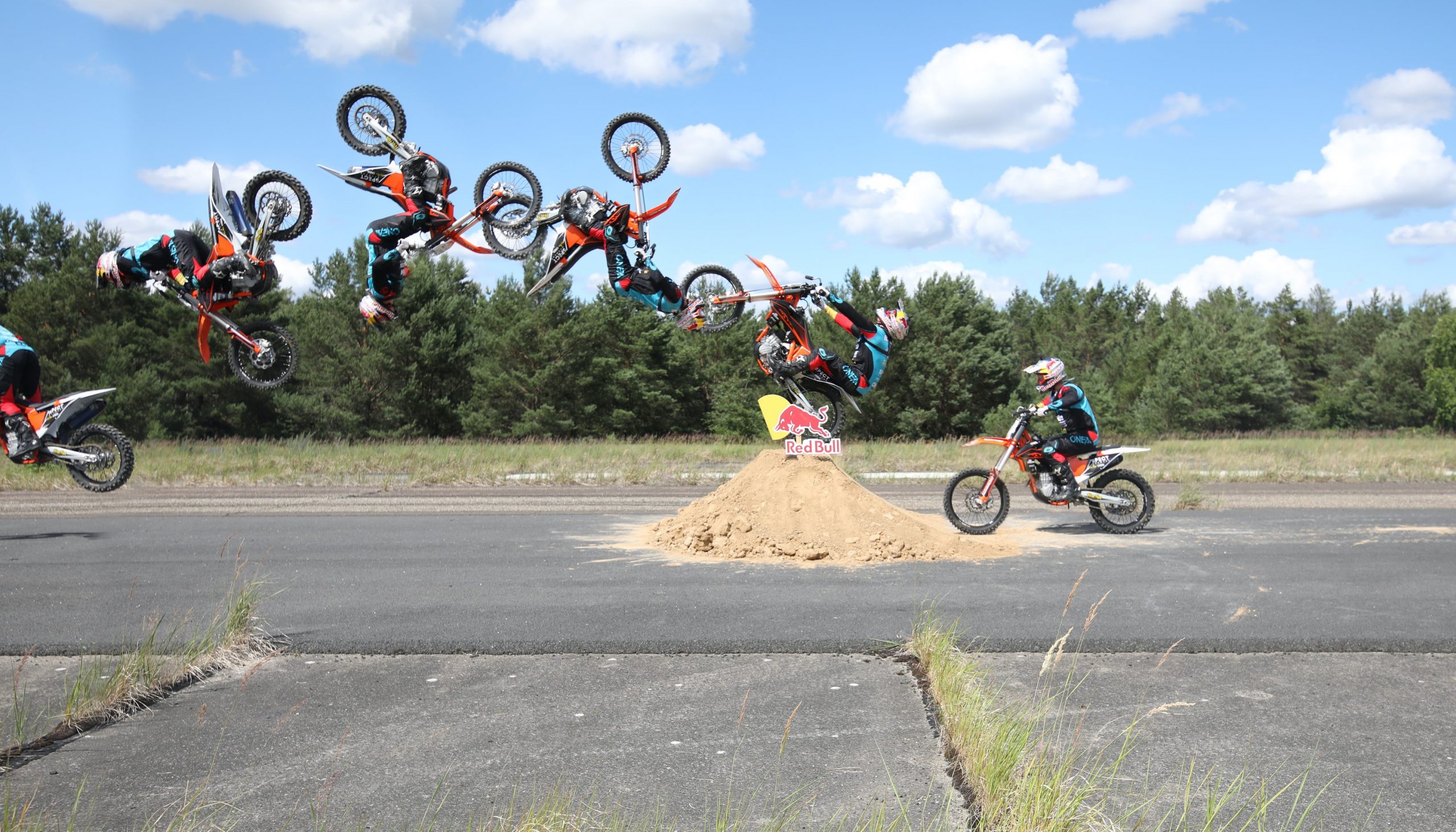 | Freestyle motocrosser, world champion Luc Ackermann (22) from Niederdorla / Thuringia, has created motorsport history again: On July 12, 2020, the FMX athlete smashed the twelve-year-old world record with the most motorcycle backflips in 30 seconds! In doing so Ackermann surpassed his idol, American legend Travis Pastrana. |