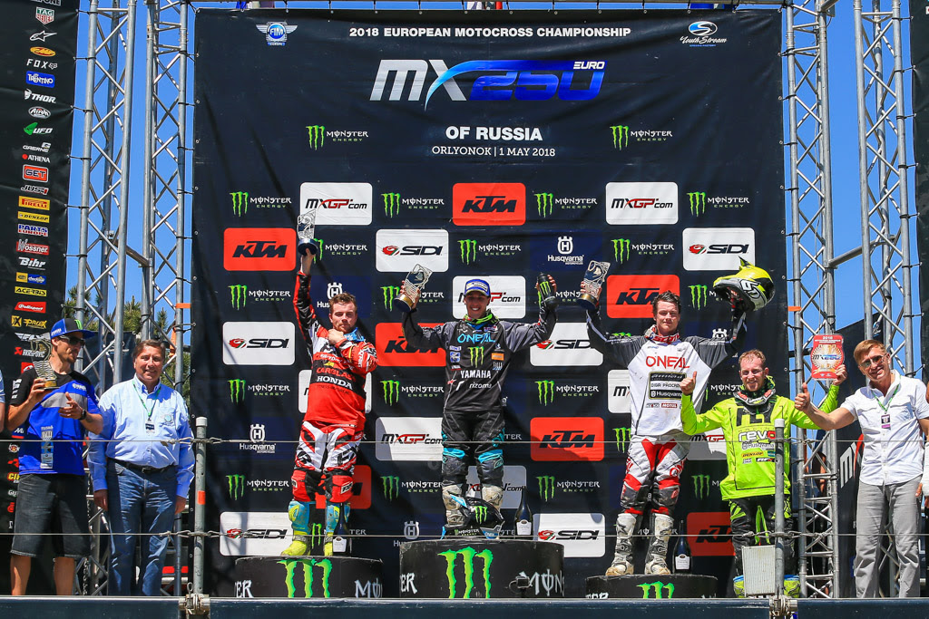 Britons Martin Barr and Steven Clarke were the stars of the EMX250 races in Russia as Clarke won a moto and took second overall, but Barr ended the day leading the series. It wasn’t so good for Barr’s team-mate Mel Pocock who started the event as series leader but was disqualified from one race after pushing a rival’s bike off his own following a crash.