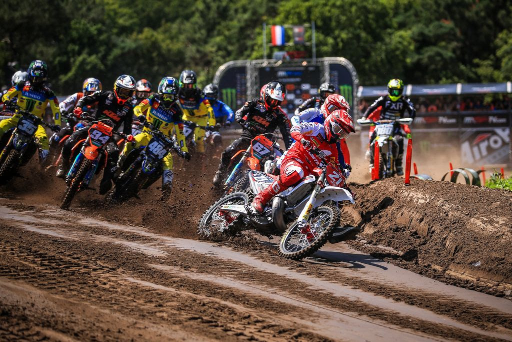 In the opening EMX250 race it was SM Action Racing Team YUASA Battery’s Kevin Horgmo who was the early race leader before crashing, which allowed Fantic Factory Team Maddii’s Nicholas Lapucci, Jorgen-Mathias Talviku of No Fear/Jumbo BT Racing Team, Yago Martinez from Team VRT Nordpesca Holland, Elzinga and Dave Kooiker of Hutten Metaal Yamaha Racing through, among others, as the Norwegian dropped to 8th.