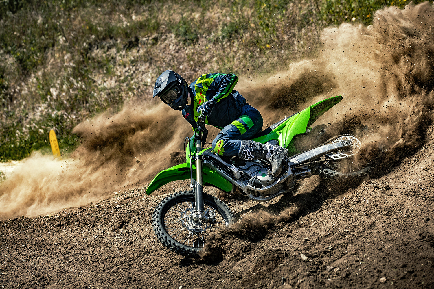 | With a comprehensive list of new features and key updates, the 2020 model KX250 motocross machine has been unveiled. As the most powerful specification production 250cc four stroke off-roader ever available from Kawasaki, the expectations for podium topping results are understandably high. Continuing the theme of Supercross and motocross success, the new model year KX250 will reward the commitment shown by both professional and eager amateur riders taking the Kawasaki quarter litre capacity MX concept to the next level. Leading the new thinking – and as the result of Kawasaki official team feedback during the current season – the front fork (along with key engine and other chassis modifications) illustrates well how seriously the Akashi factory takes off-road sport. Chief among the front fork changes is the adoption of a Kayaba (KYB) assembly incorporating a new high-performance ø48 mm inverted coil-spring fork. The large-diameter inner tubes enable the use of large damping pistons, delivering smooth action and firm damping. Stiffer spring rates front and rear match the KX250’s increased power. The fork’s improved ability soak up bumps at the initial part of the stroke is complemented by increased firmness for handling large impacts and matched to the rear shock which features dual compression adjustability, allowing high-speed and low speed damping to be tuned separately. Speaking of power, the headlines are dominated by changes to the cylinder head group and induction modifications. Featuring finger follower valve actuation most recently adopted by the Superbike world championship winning Ninja ZX-10RR, this new direction facilitates a higher rev ceiling and more aggressive camshaft timing whilst reducing overall valve train weight. Boasting an increase in peak power of approximately 2.4 kW (3.3 PS), and performance focused on the high-rpm range, the stronger high-rpm engine gives riders a special advantage on the straights. Combined with a higher rev limit, it’s now easier to tie corners together for quicker lap times. Additionally, a revised airbox construction features a shorter (120 mm > 70 mm) tapered intake funnel, which contributes to increased high-rpm performance. Another KX250 innovative feature is the dual injectors – a feature since 2012 – utilising an injector downstream of the throttle valve (where injectors are located on standard FI systems). With that in mind, the larger diameter (ø43 mm >> ø44 mm) throttle body flows a greater volume of air, contributing to increased high-rpm performance, while repositioning the intake duct allows an even straighter approach for intake air. Finally, downdraft-style intake routing increases the intake air’s approach angle into the cylinder from 29.5º to 32.5º, improving cylinder-filling efficiency and contributing to increased engine power. These stand-out features – along with a long list of clever additional updates – combine to create the most powerful production KX250 four-stroke yet and a prime candidate for podium topping rides. Within an environment where not simply winning on track is of high importance but also meeting and exceeding the efforts of rival manufacturer’s, Kawasaki has once more taken the highly successful KX250 concept to an even higher level. As machines soon become available in dealers, committed and motivated Team Green enthusiasts, plus the huge number of Kawasaki focused off-road teams, will be able to experience first-hand the “most powerful yet” Kawasaki KX250. |
