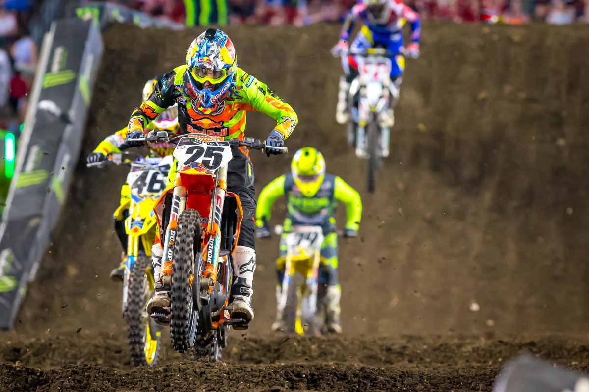 Mild-mannered Marvin Musquin muscled race leader Eli Tomac out of the way to take a last-gasp victory in the Foxborough Supercross. Musquin got a great start and led for the majority of the moto until Tomac squeezed past. But the Frenchman barged the Kawasaki man out of the way on the last lap to take the win. Tomac was furious at the move which he called: “A cheap shot”.