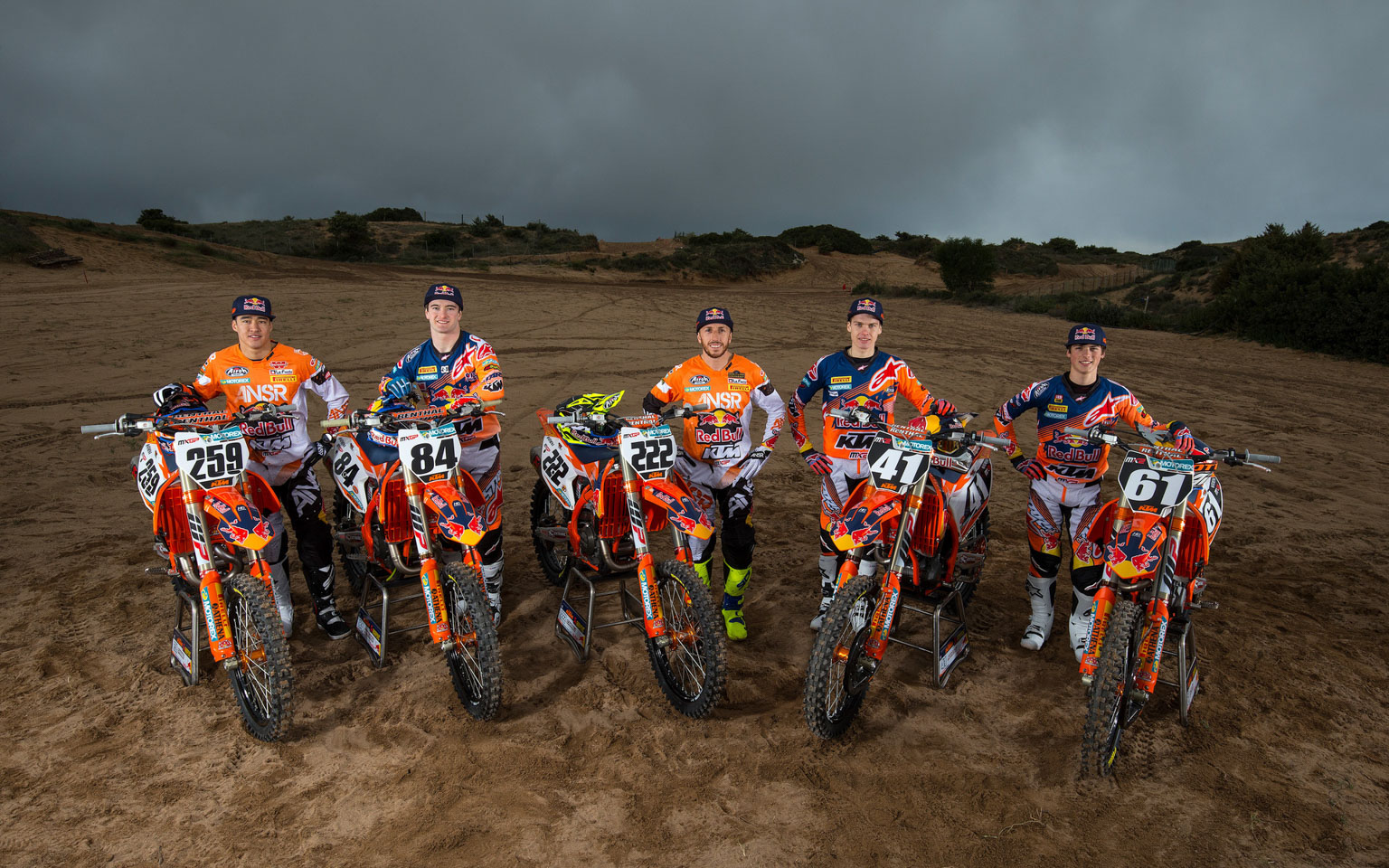 The powerhouse factory KTM team and their 2017 factory bikes have been showcased to the world in a photoshoot in Sardinia, shot by top UK lensman Ray Archer. The 450 riders Jeffrey Herlings, Tony Cairoli, Glenn Coldenhoff were joined by 250 aces Pauls Jonass and Jorge Prado on the seaside track at Riola Sardo. And check out Jeffrey Herlings’ latest buttpatch!