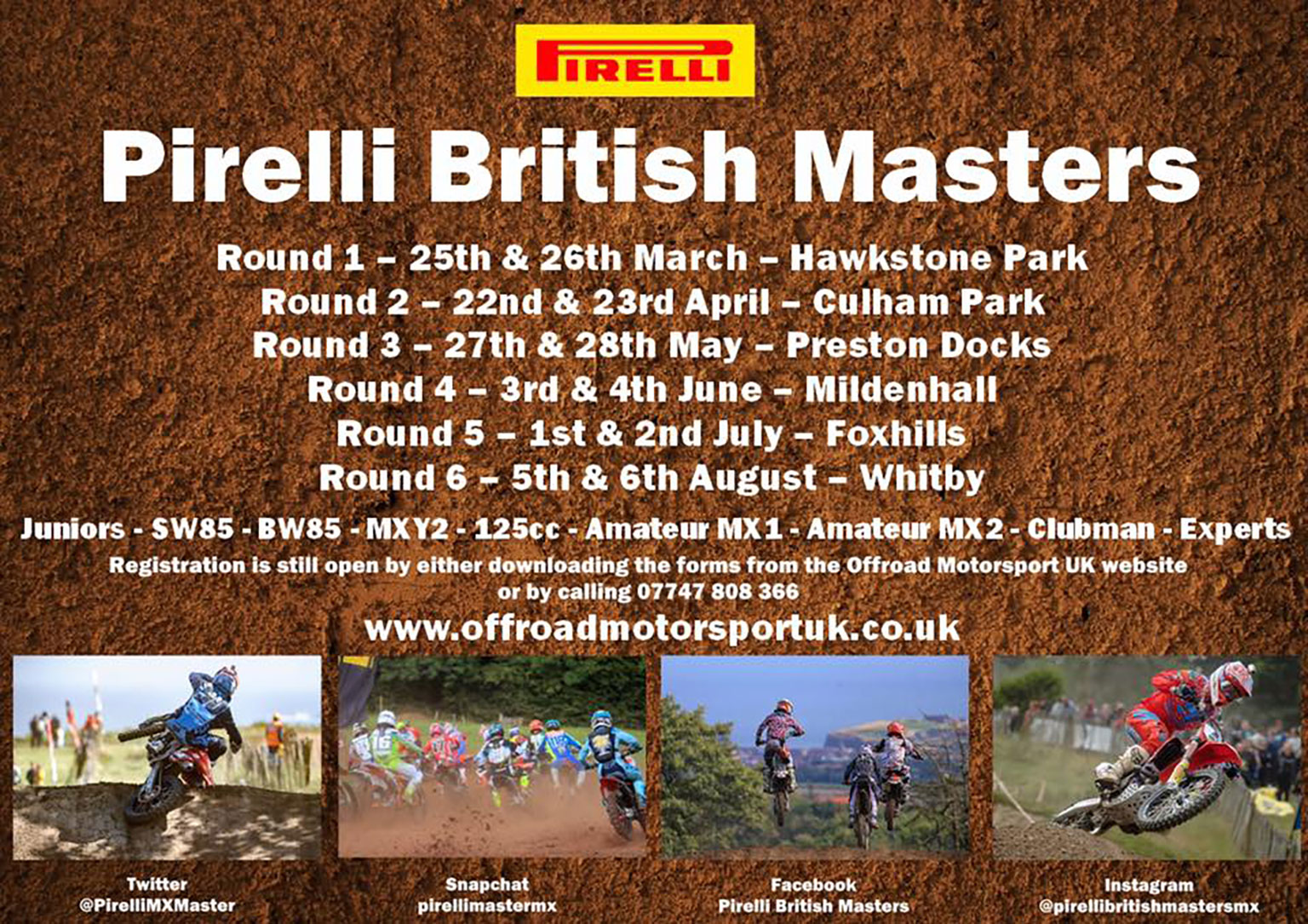 The Pirelli British Masters championship has finalised its calendar for 2017 and takes in many of the UK’s top tracks like Hawkstone Park, Culham, Whitby and Canada Heights. The series, which caters for juniors, SW85, BW85, MXY2 right through to adult pro, starts at Hawkstone on March 25-26, then goes to Culham on April 22-23. Then it’s Preston Docks on May 27-28, Mildenhall June 3-4, Foxhills on July 1-2, and then Whitby on August 5-6. More details HERE.