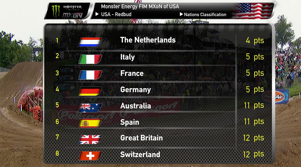 In the final race for Open class bikes, Holland topped Nations qualifying as Glenn Coldenhoff took the win from Justin Barcia who helped the USA to qualify. Belgium also scraped through as Jeremy Van Horebeek was third.