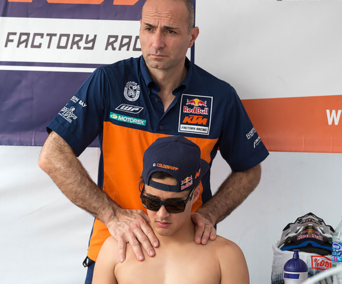 “The typical injuries tend to be the muscular, and fortunately most are low-intense problems that can be solved with a session of treatment,” he reveals. “What is really important is immediate intervention otherwise the muscle could lose up to 50% of its power and efficiency. A critical time in this sport is between the first and second moto; you have to react straightaway and that involves deep local massage to stretch the muscle. Then you can also use taping – and I use a lot of this with the KTM athletes – and then a general massage to recalibrate and rebalance the body.”