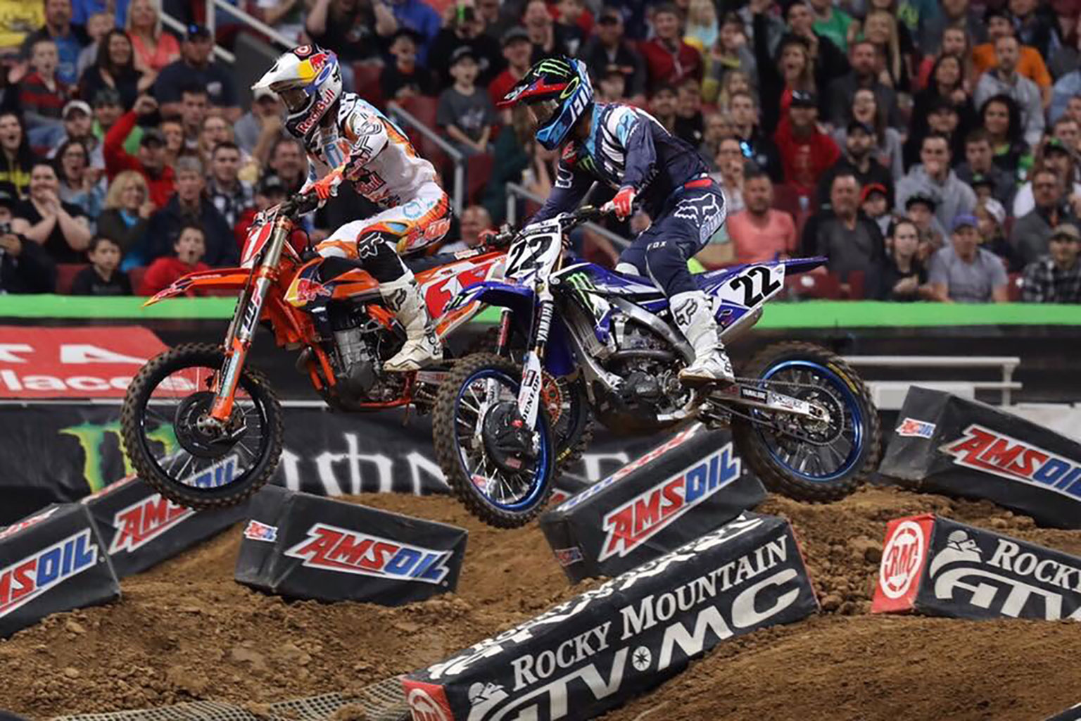 Dungey was ready for a showdown to start the 450SX Class Main Event, claiming the SupercrossLive.com Holeshot aboard his Team Red Bull KTM Factory Racing machine just ahead of Tomac. However, Tomac wasted little time in getting out front and made an aggressive pass on Dungey on the opening lap to take the lead. Dungey gave chase, while his Team Red Bull KTM Factory Racing teammate Marvin Musquin settled into third.
