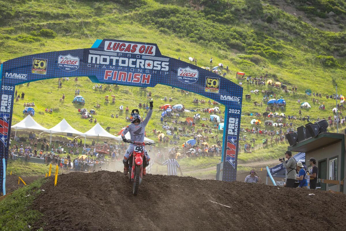 | Moto 1The first gate drop of the afternoon got underway with Red Bull KTM Factory Racing’s Antonio Cairoli leading the way with the MotoSport.com Holeshot, with Roczen in close pursuit. The two former World Champions duked it out throughout the opening lap where Roczen was able to make the pass and open a gap. Behind them, Troy Lee Designs/Red Bull/GASGAS Factory Racing’s Justin Barcia settled into third, just ahead of Monster Energy Kawasaki’s Jason Anderson and Team Honda HRC’s Chase Sexton, the season’s two overall winners. A torrid pace in the early stages of the moto allowed Roczen to establish a lead of nearly three seconds, while the remaining front runners engaged in a multi-rider battle that saw Barcia move into second and drop Cairoli to third. Anderson followed through into third soon after. Cairoli continued to lose positions and soon fell outside the top five. Back out front, the battle for second intensified between Barcia, Anderson and Monster Energy Star Yamaha Racing’s Eli Tomac, a Colorado native. Anderson made an impressive pass to take control of second just before the halfway point and Tomac eventually got around Barcia for third several laps later. As the moto entered its final 10 minutes, the battle for second heated up between Anderson and Tomac. The Yamaha rider pounced at the first opportunity and stormed past, which put Tomac just over five seconds behind Roczen with eight minutes to go. With the support of the home crowd Tomac went on the attack and erased the deficit in a matter of a couple laps. Once he closed onto Roczen’s rear fender Tomac pulled the trigger on a pass and got by the Honda with ease, to the delight of the fans in attendance. Roczen kept Tomac honest for a couple laps after losing the lead, but the Yamaha rider was too consistent and pulled away in the closing stages. Tomac took his second consecutive moto win by 3.1 seconds over Roczen, followed by Anderson in third. Sexton finished in fourth, while Cairoli finished strong to claim fifth. |