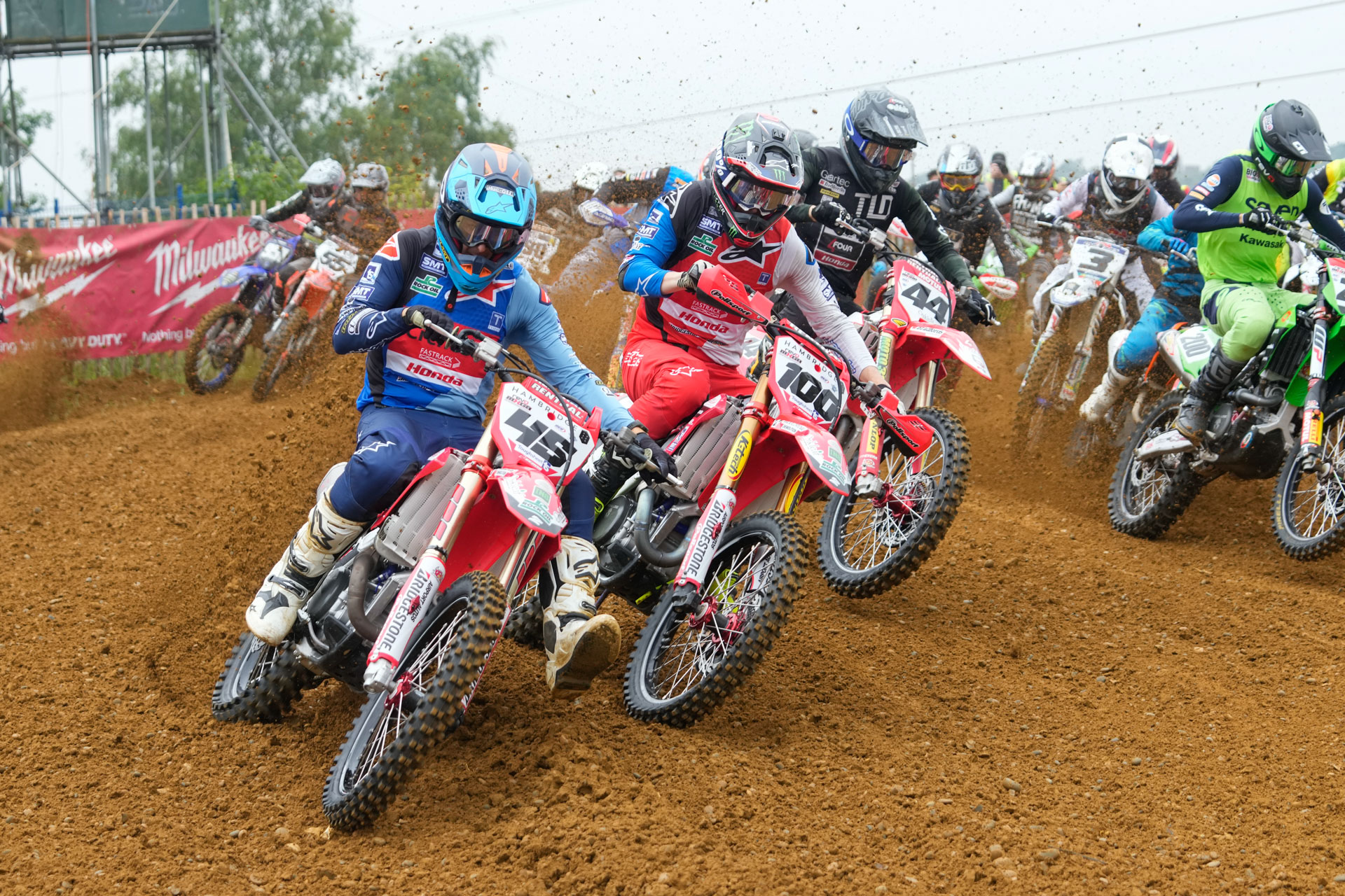 The deciding final moto was in treacherous conditions as rain just before the start turned the hard and bumpy track into a greasy test of nerve. Searle took the holeshot again on his potent Honda CRF450R and led, but wisely didn’t fight back too hard when he was challenged for the lead. He took a calculated third in the race for a clear overall win. And Nicholls, who didn’t get a great start this time, came through the pack in a series of brave overtakes to claim fifth place and a brilliant second overall.