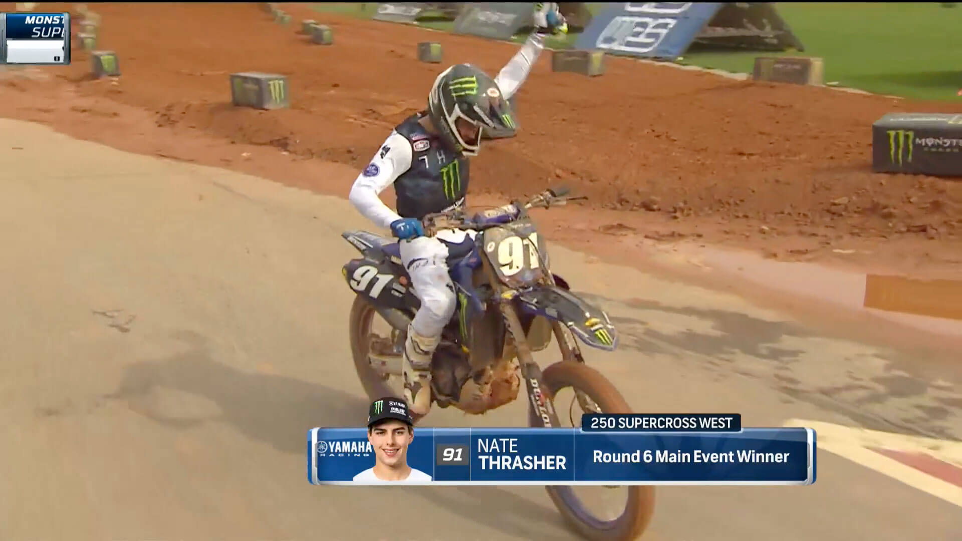 Rookie Nate Thrasher only qualified for the Atlanta SX 250 main event by winning the LCQ, then went on to pull off a shock win the final! The 18-year-old, whose previous best ever was ninth, had a 13 second lead on the last lap as he romped to an easy win from Star Yamaha team-mate and points leader Justin Cooper, from Cameron McAdoo.