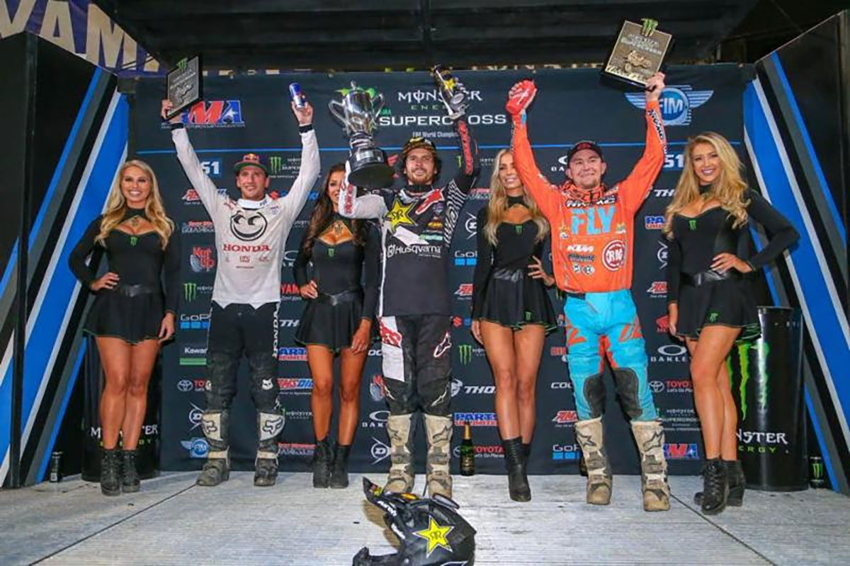 Rockstar Energy Husqvarna Factory Racing’s Jason Anderson rallied from a sixth-place start to meet Team Honda HRC’s Ken Roczen in a battle for the lead on the last lap, which ended with Anderson taking the win by less than a second.