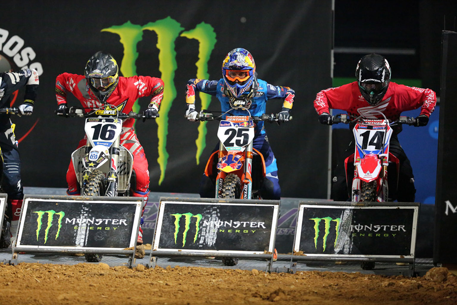 American Zach Osborne, second on the first night, had a poor start but fought his way back to fourth place to take fourth overall. Fifth was Jeremy Martin, who missed the first night’s action as he hurt his wrist in practice. But it was strong enough for him to race on Sunday. Fellow American Honda rider RJ Hampshire, not looking too comfortable on his borrowed CRF, took ninth for eighth overall. Frenchman Cedric Soubeyras was first of the non-AMA supercross stars in fifth overall from Fabien Izoird.