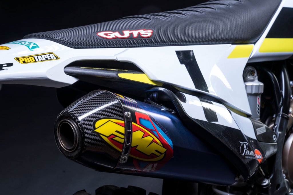The FMF silencer and GUTS seat cover are cool and do a great job