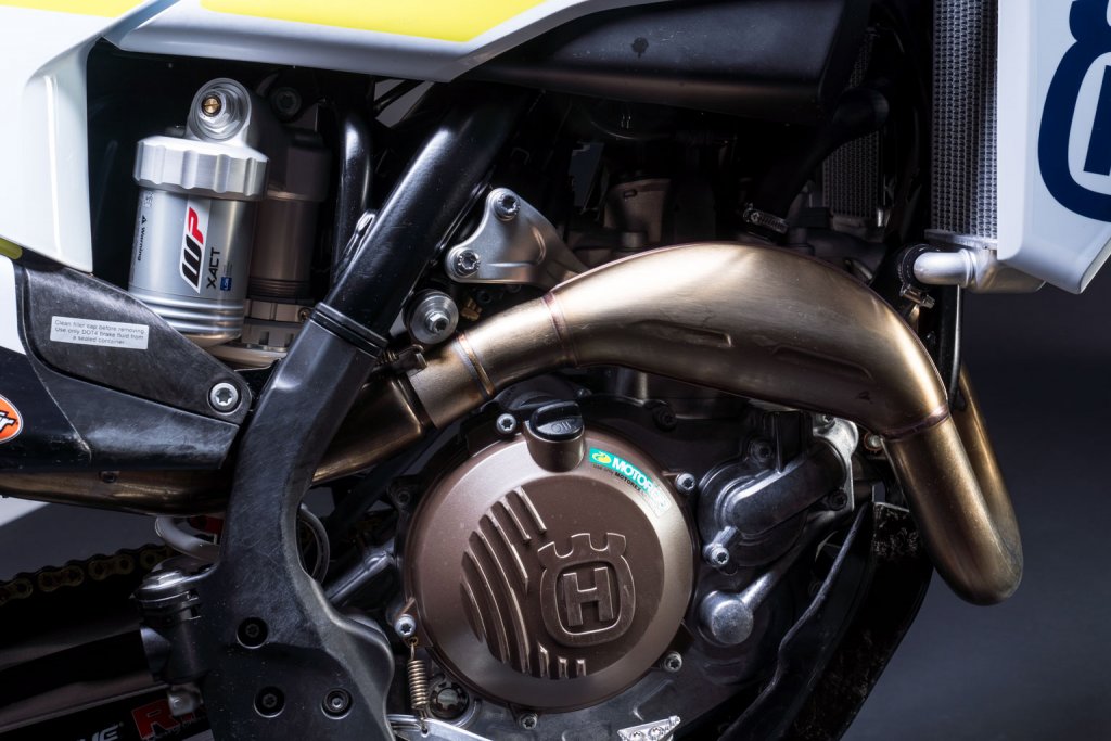 What it does have is lots of bling from the Husky catalogue, like the factory-spec wheels with D.I.D DirtStar rims, a holeshot device, carbon fibre reinforced skid plate, disc guard, floating front brake disc, Jason Anderson graphics, and all-new CNC-machined triple clamps with a different steering stem stiffness for a smoother smooth fork action. The clamps offer offset adjustment between 20 or 22mm. So far, so bolt-on bits.