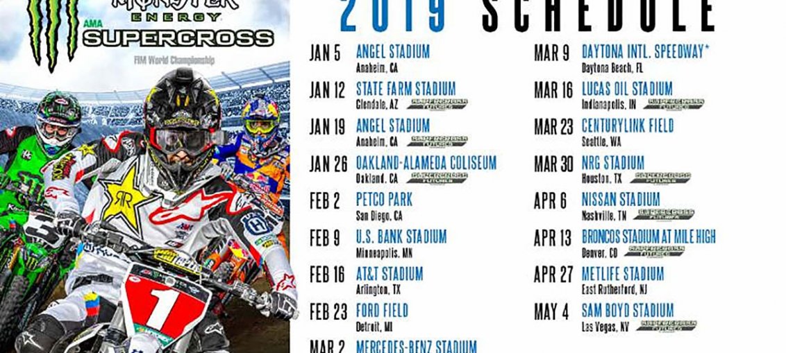 The 17-round schedule for the 2019 season of Monster Energy AMA Supercross, an FIM World Championship, will deepen its live event footprint with new and returning markets and the debut of Supercross Futures, an AMA Amateur National Championship.