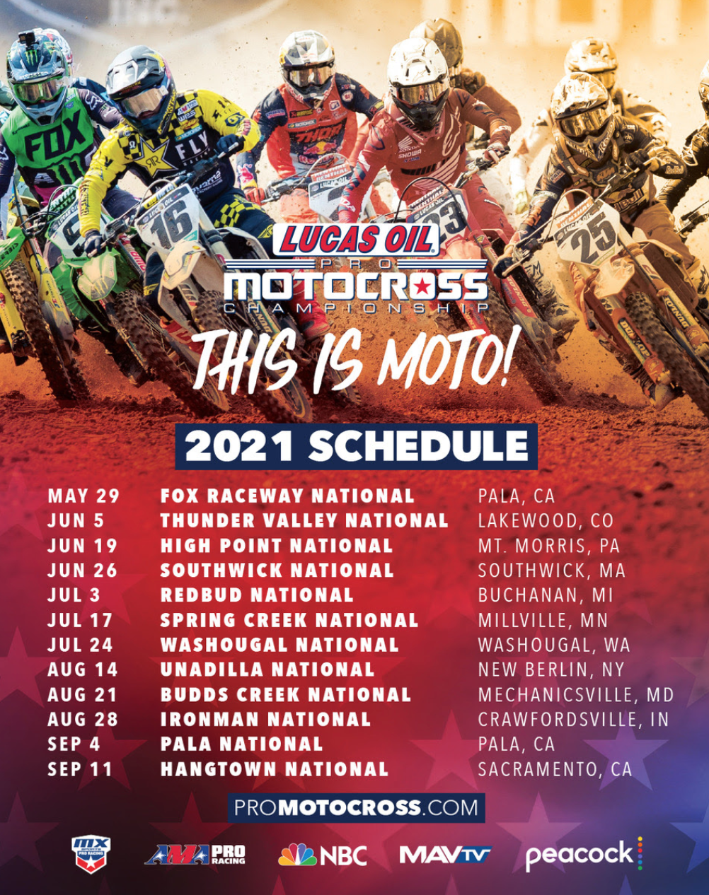 MX Sports Pro Racing, in partnership with NBC Sports, has announced a 12-round schedule for the upcoming 2021 Lucas Oil Pro Motocross Championship, sanctioned by AMA Pro Racing. As the sport continues to navigate the ongoing battle against the COVID-19 pandemic this summer’s racing calendar will welcome the return of some of the most iconic venues in American motocross, with spectator attendance anticipated at every event.