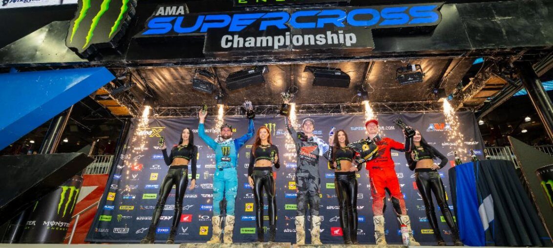 | 450SX Class podium (racers left to right) Chase Sexton, Eli Tomac, and Jason Anderson. Photo Credit: Feld Motor Sports, Inc. 450SX Class Results1. Eli Tomac, Cortez, Colo., Yamaha2. Chase Sexton, Clermont, Fla., Honda3. Jason Anderson, Rio Rancho, N.Mex., Kawasaki4. Aaron Plessinger, Hamilton, Ohio, KTM5. Cooper Webb, Newport, N.C., KTM6. Justin Barcia, Greenville, Fla., GASGAS7. Justin Cooper, Tallahassee, Fla., Yamaha8. Ken Roczen, Clermont, Fla., Suzuki9. Joey Savatgy, Clermont, Fla., Kawasaki10. Adam Cianciarulo, New Smyrna Beach, Fla., Kawasaki 450SX Class Championship Standings1. Eli Tomac, Cortez, Colo., Yamaha (95)2. Chase Sexton, Clermont, Fla., Honda (88)3. Cooper Webb, Newport, N.C., KTM (83)4. Jason Anderson, Rio Rancho, N.Mex., Kawasaki (76)5. Ken Roczen, Clermont, Fla., Suzuki (73)6. Justin Barcia, Greenville, Fla., GASGAS (65)7. Aaron Plessinger, Hamilton, Ohio, KTM (64)8. Dylan Ferrandis, Tallahassee, Fla., Yamaha (56)9. Adam Cianciarulo, New Smyrna Beach, Fla., Kawasaki (56)10. Joey Savatgy, Clermont, Fla., Kawasaki (53) |