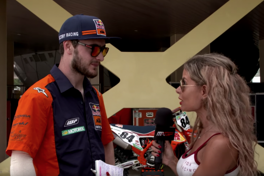 Jonass was pushing his way through the field up into the top ten from the first turn crash. Covington lost 2nd to Olsen and then nearly lost 3rd to Lawrence but another mistake from the Australian gave Covington breathing room. Jonass eventually made it up to 8th after passing Hitachi KTM UK’s Conrad Mewse while Prado took the win with Olsen 2nd and Covington 3rd.