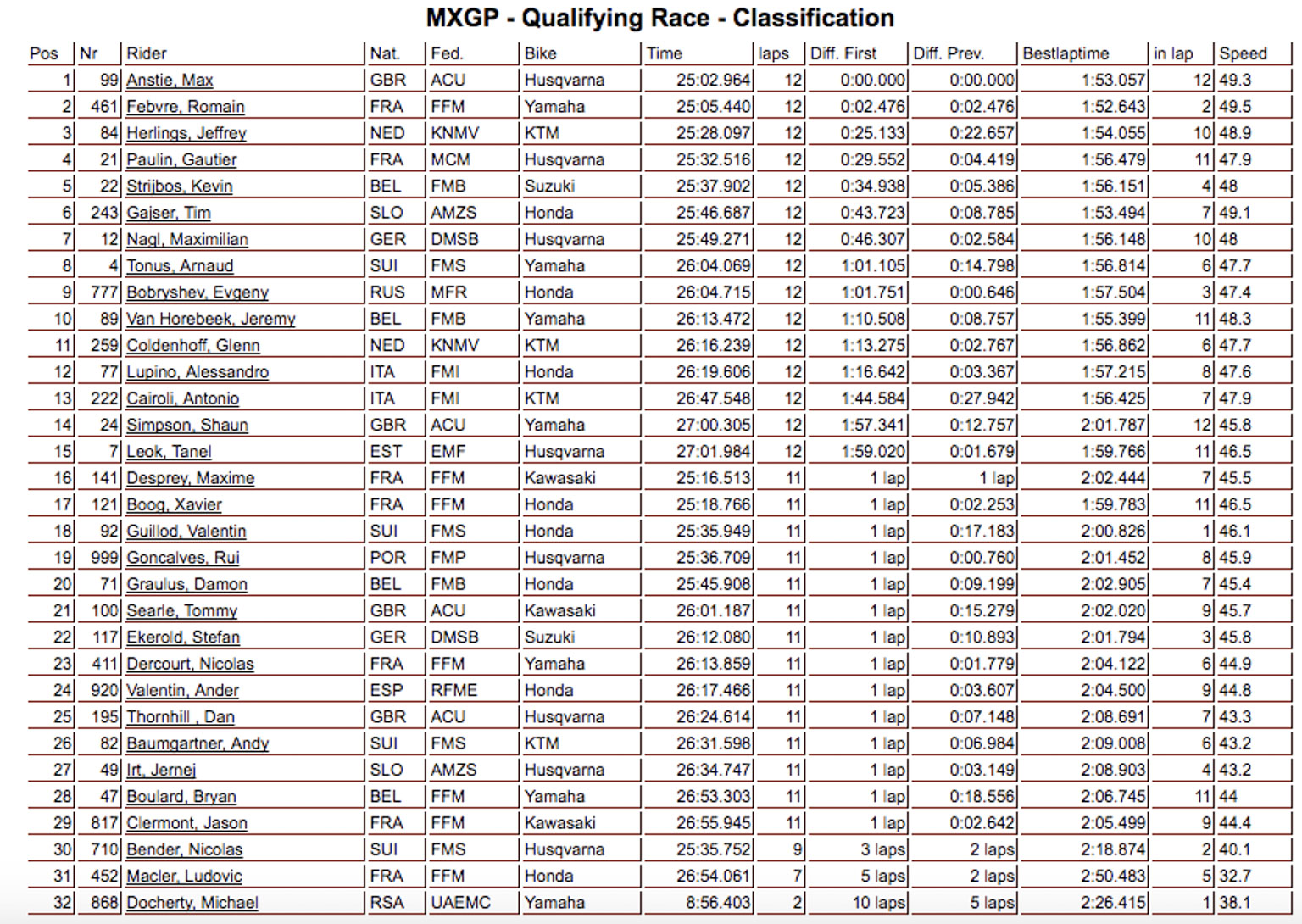 Max Anstie took his first MXGP qualifying race win after narrowly defeating former world champ Romain Febvre on French soil in the final MXGP of the year at Villars-Sous-Ecot. Jeffrey Herlings, who collided with Tim Gasjer early on in the moto, came back to third place on the muddy track.
