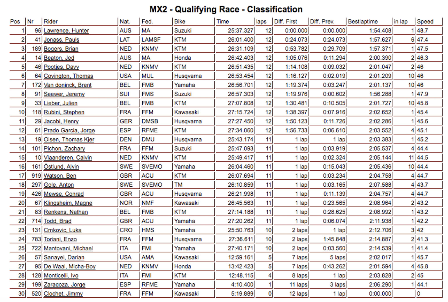 In the MX2 qualifier, Hunter Lawrence took the win from Pauls Jonass who is looking to clinch his first world title.
