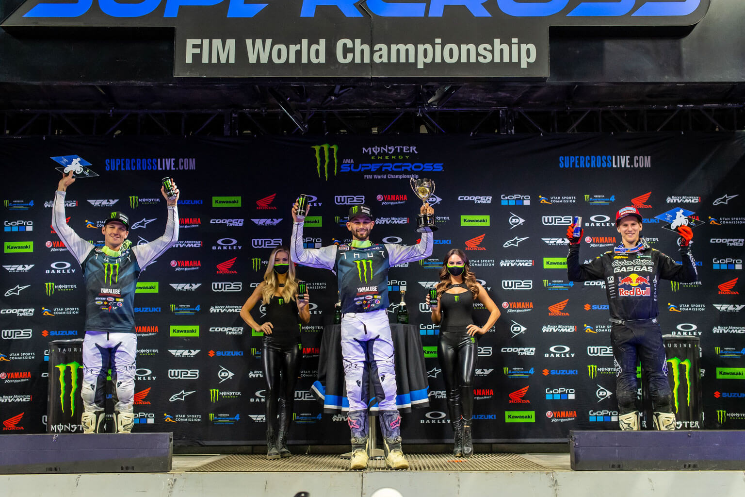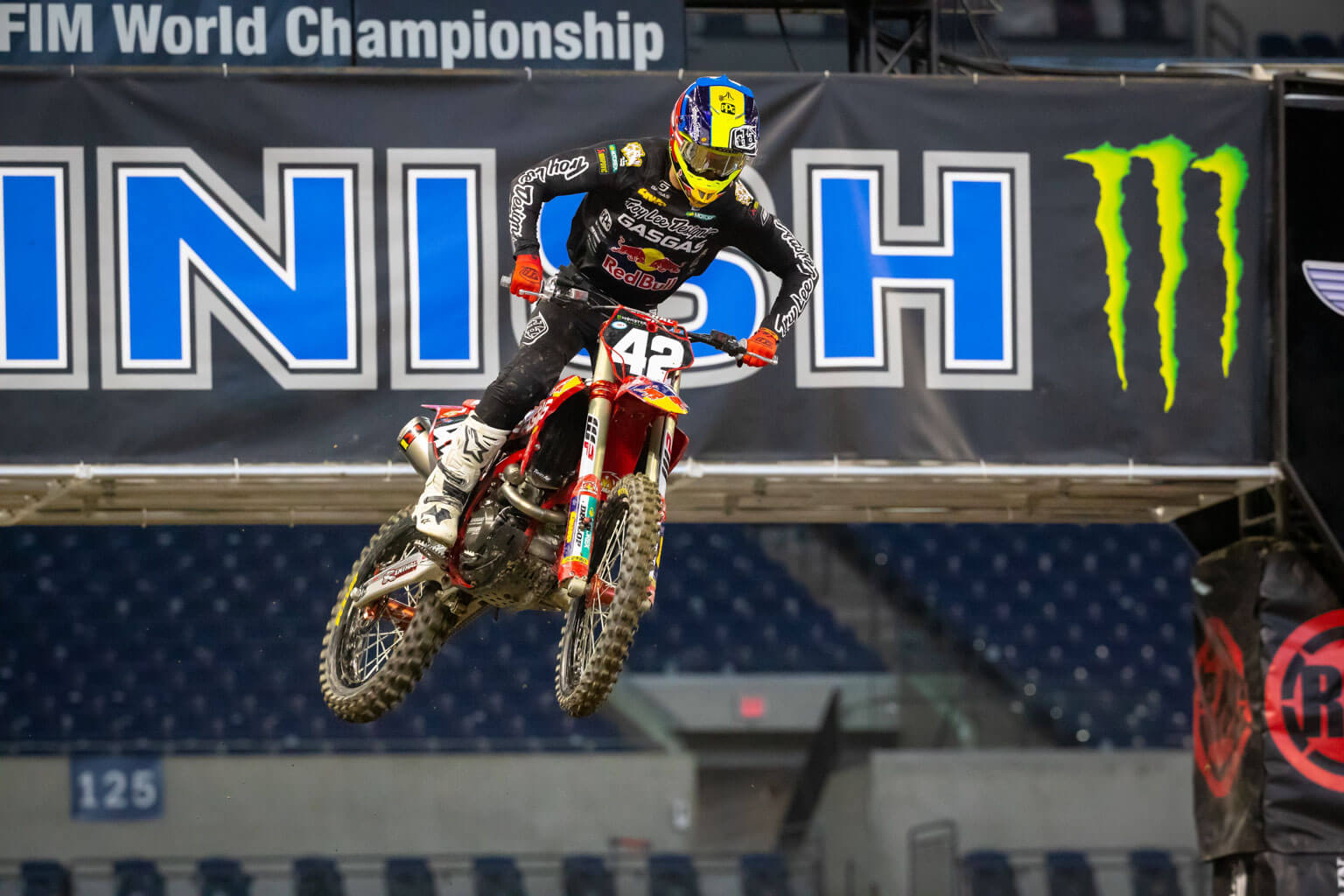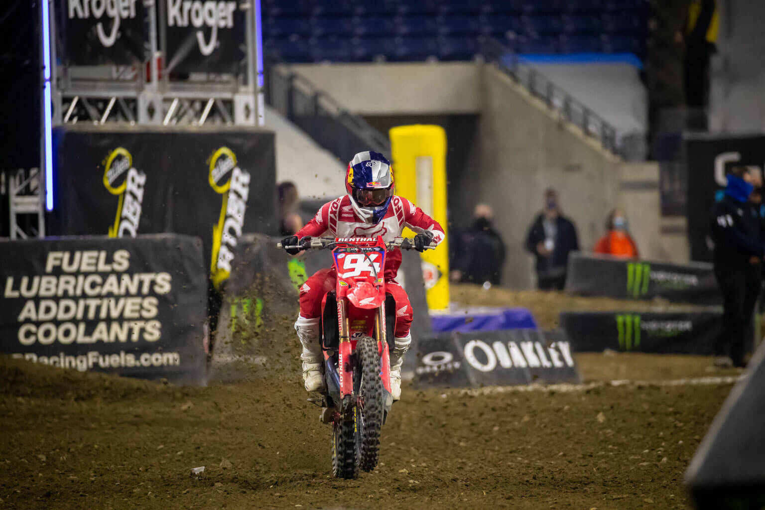 Team Honda HRC’s Ken Roczen backed up his 450SX Class win at Round 4 with a dominating victory at the second Indianapolis round. Opening round winner Troy Lee Designs / Red Bull / GASGAS Factory Racing’s Justin Barcia held off defending champion Monster Energy Kawasaki’s Eli Tomac to fill out a podium of 2021 race winners.