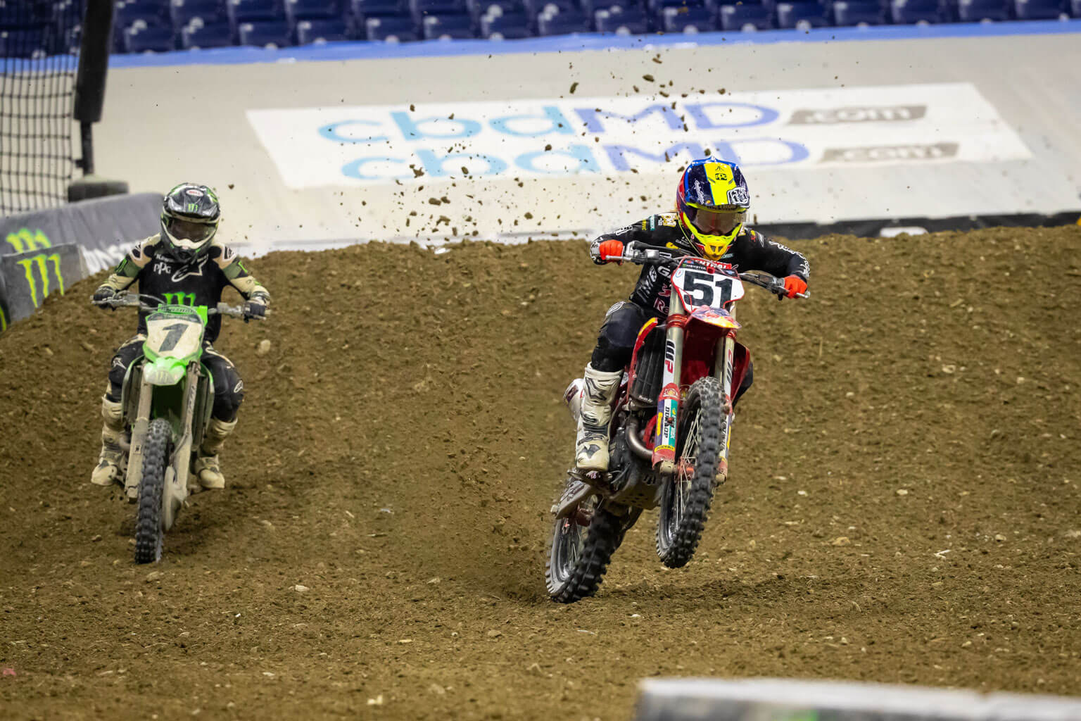 It was a wild night for the Eastern Regional 250SX Class riders but at the checkers it was Yamaha’s Colt Nichols grabbing his third consecutive win – only his fourth career win. It was Troy Lee Designs / Red Bull / GASGAS Factory Racing’s Michael Mosiman who grabbed the holeshot and started to pull away in the opening laps. He’d earned GASGAS its first 250SX podium one race before and looked destined to give the brand its first win in its debut Supercross season. Unfortunately, a lapped rider crashed on a rhythm section; Mosiman bumped the rider and had to nearly stop to swerve around the downed bike.