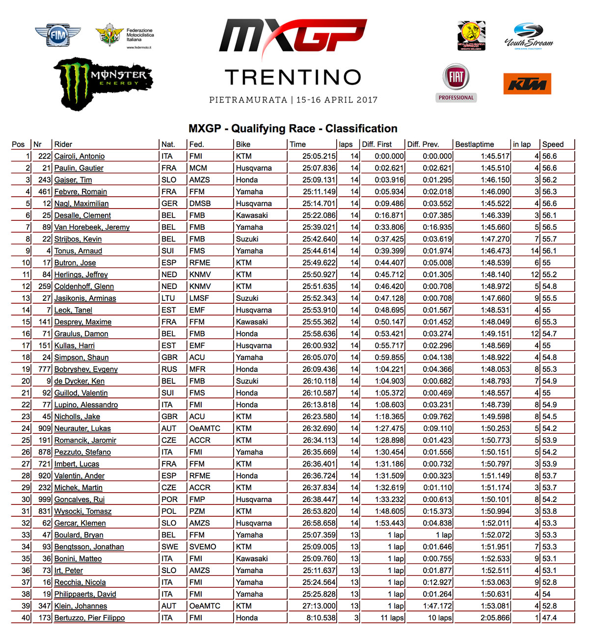 Home hero Tony Cairoli took a start-to-finish win the the MXGP qualifying at Trentino, his first qualifying race win of the year. French Husky ace Gautier Paulin fought off the challenge from world champ Tim Gajser to take second place.