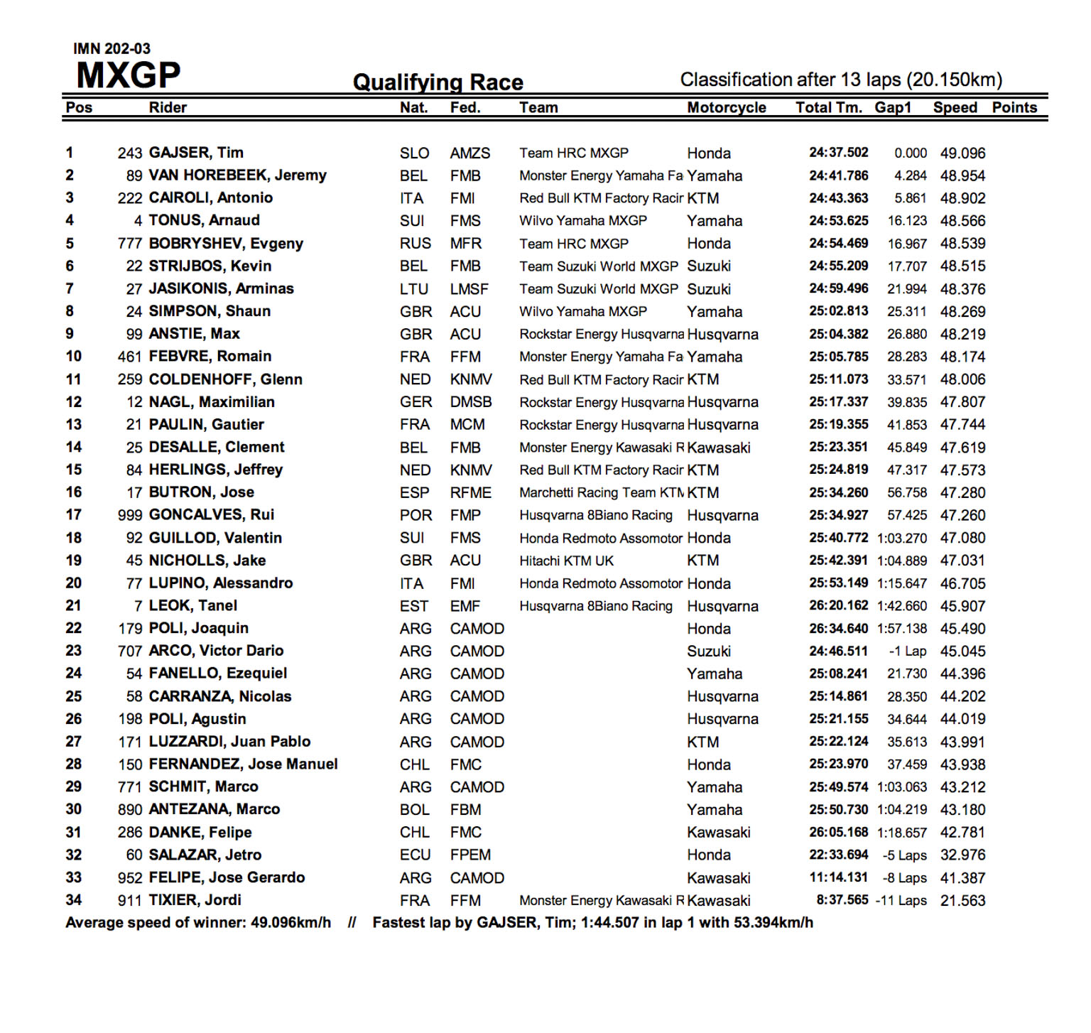 Third was American Darien Sanyei, riding for the British Monster Kawasaki team, as crashed hindered many of the top men like championship leader Julien Lieber, Indonesian GP winner Jeremy Seewer and Thomas Kjer Olsen.