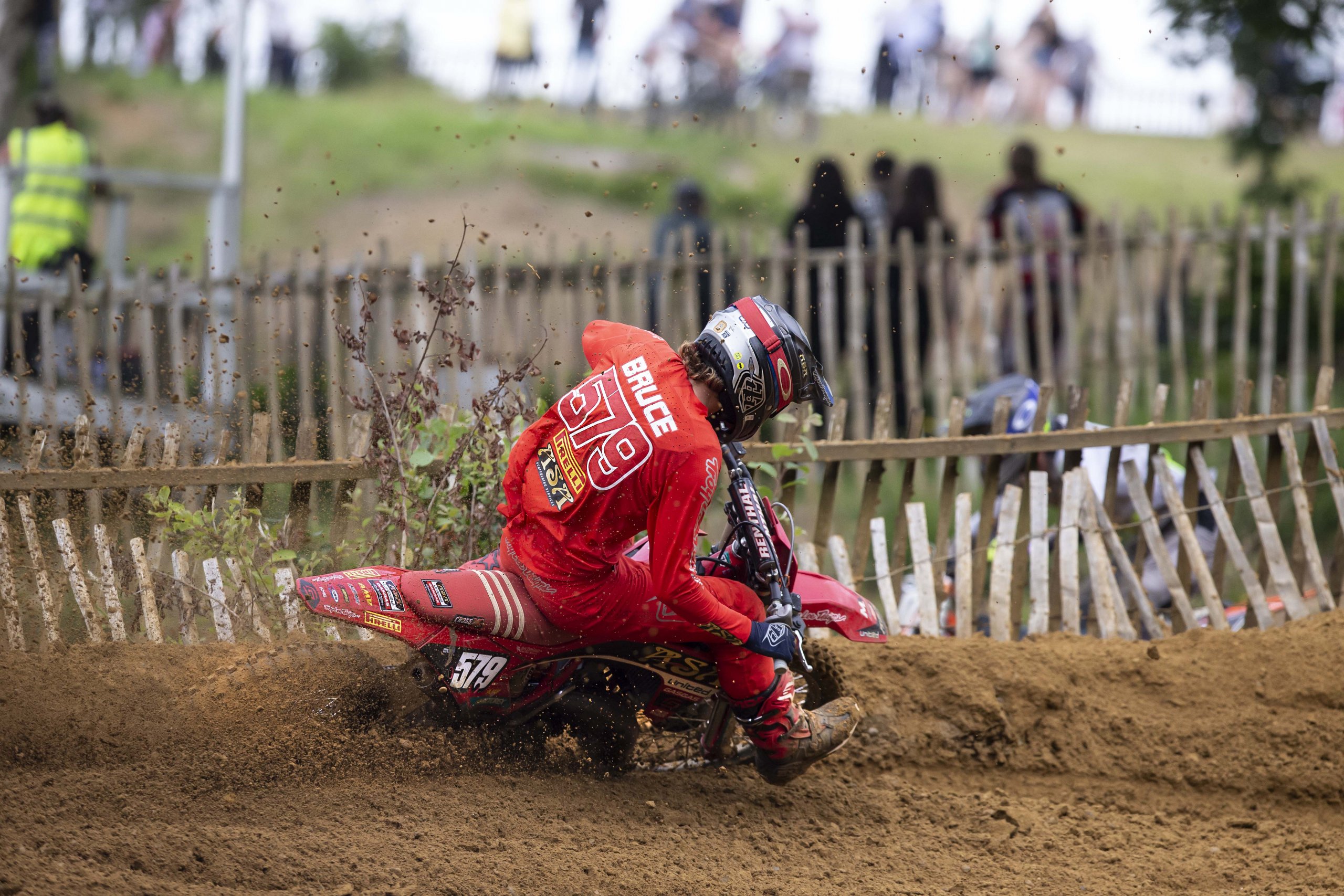 Bruce was always going to be outgunned on his 125 two-stroke machine up the long Canada Heights start straight against the bigger four-stroke bike, so as Carter got the holeshot at the start of “A” race one, Bruce was mid-pack, but everyone knew he was not going to stay there.