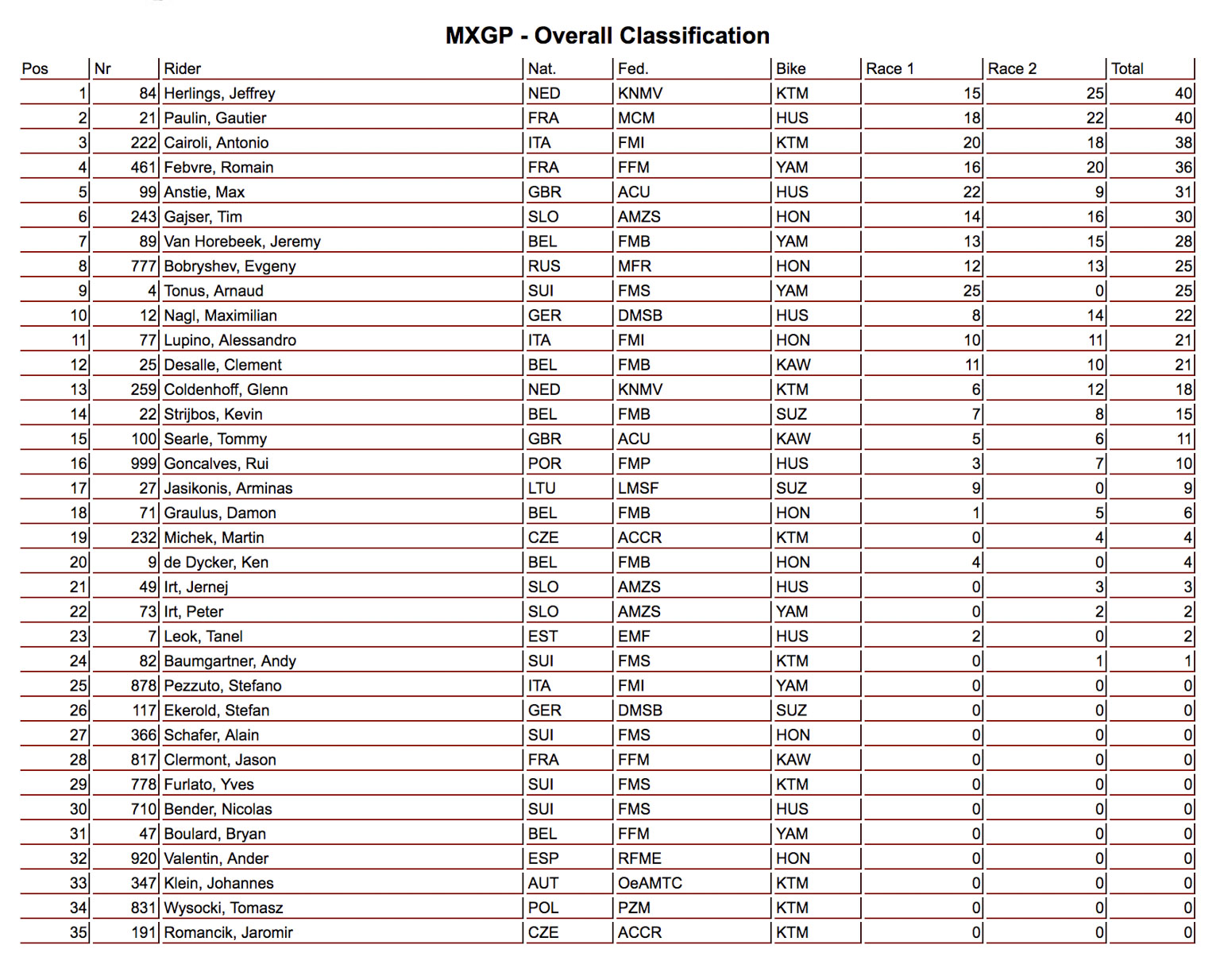 Herlings had a bad start in the opening moto and could only get through to sixth place. But second time out he led from the opening lap and was soon pulling away at the front, taking an unchallenged win.