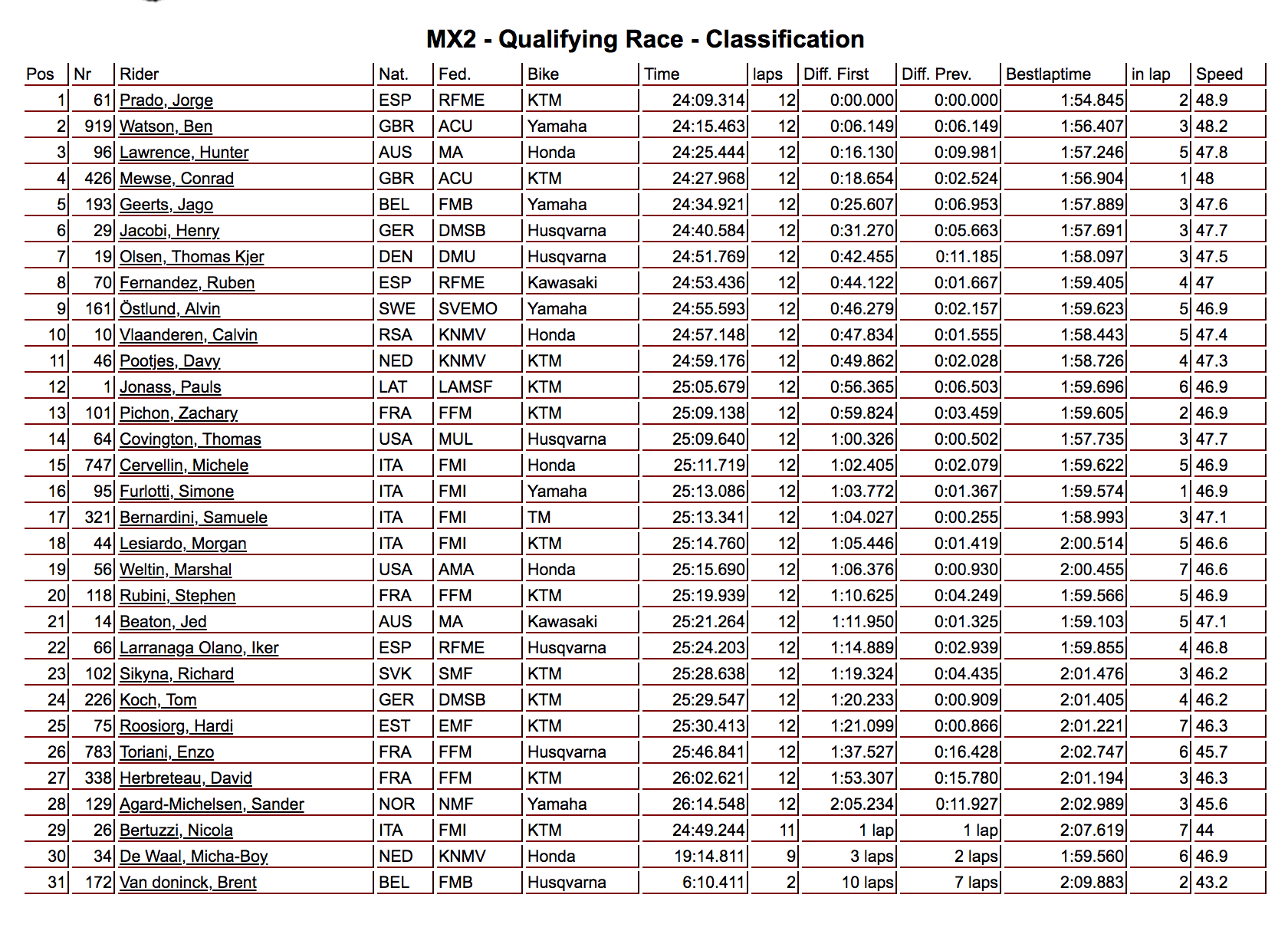 Prado led from the start, chased by Mewse, Thomas Covington, Henry Jacobi, Lawrence, and Watson while Thomas Kjer Olsen was 24th, right in front of world champ and home hero Pauls Jonass.