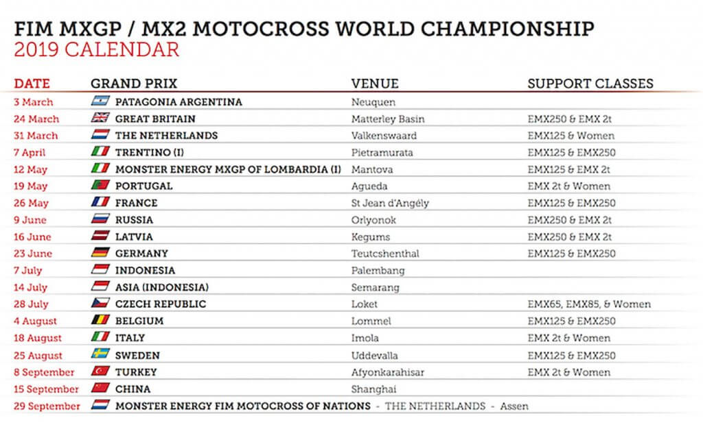 The cancellation comes as a request by the organiser who is eager to refocus on holding MXGP in March 2020. Due to the timing of the cancellation no replacement will be made giving riders and teams an additional week prior to racing the final event of 2019, the Monster Energy FIM Motocross of Nations.