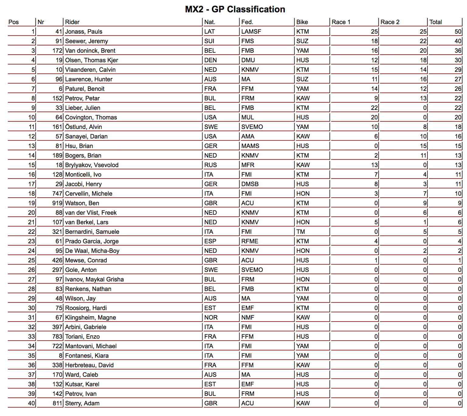 Jonass’ charge was helped as many of the top riders had problems. Jorge Prado, winner of the last GP in Italy, had two flying starts but ended up crashing in both motos. Julien Lieber, second in the opener, went out in the opening lap of the second race. And Thomas Covington, third first tiome out, crashed early in race two and retired with a damaged bike.