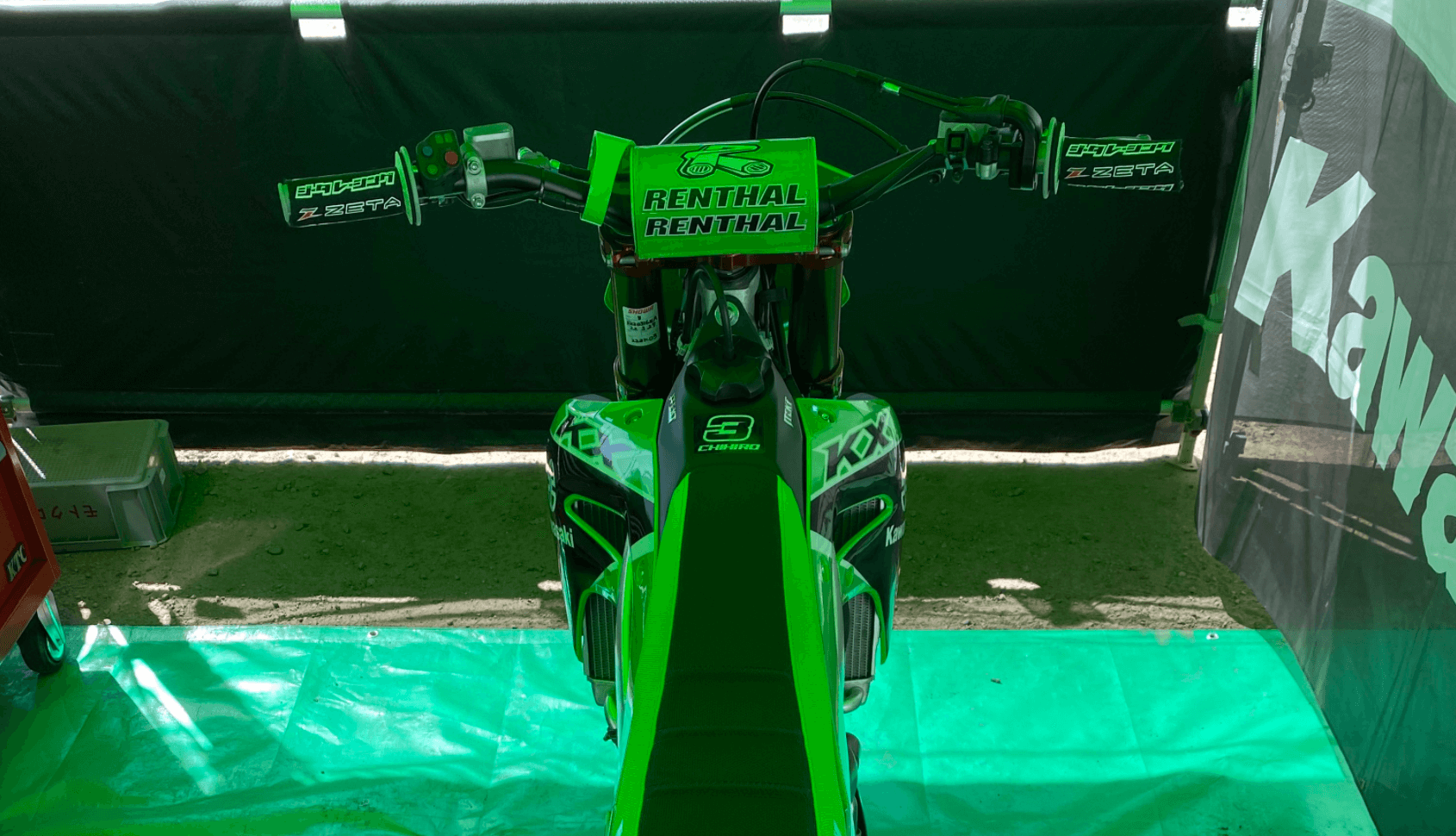 Although at first glance it doesn’t look hugely different to the current bike, on closer inspection the cylinder head is totally different and much shorter, looking very like the KX350 twin-cam design. And the frame has new mounting points with the subframe is bolted on much higher. The rear suspension linkage is new, and the bike runs Brembo brakes rather than Nissin.