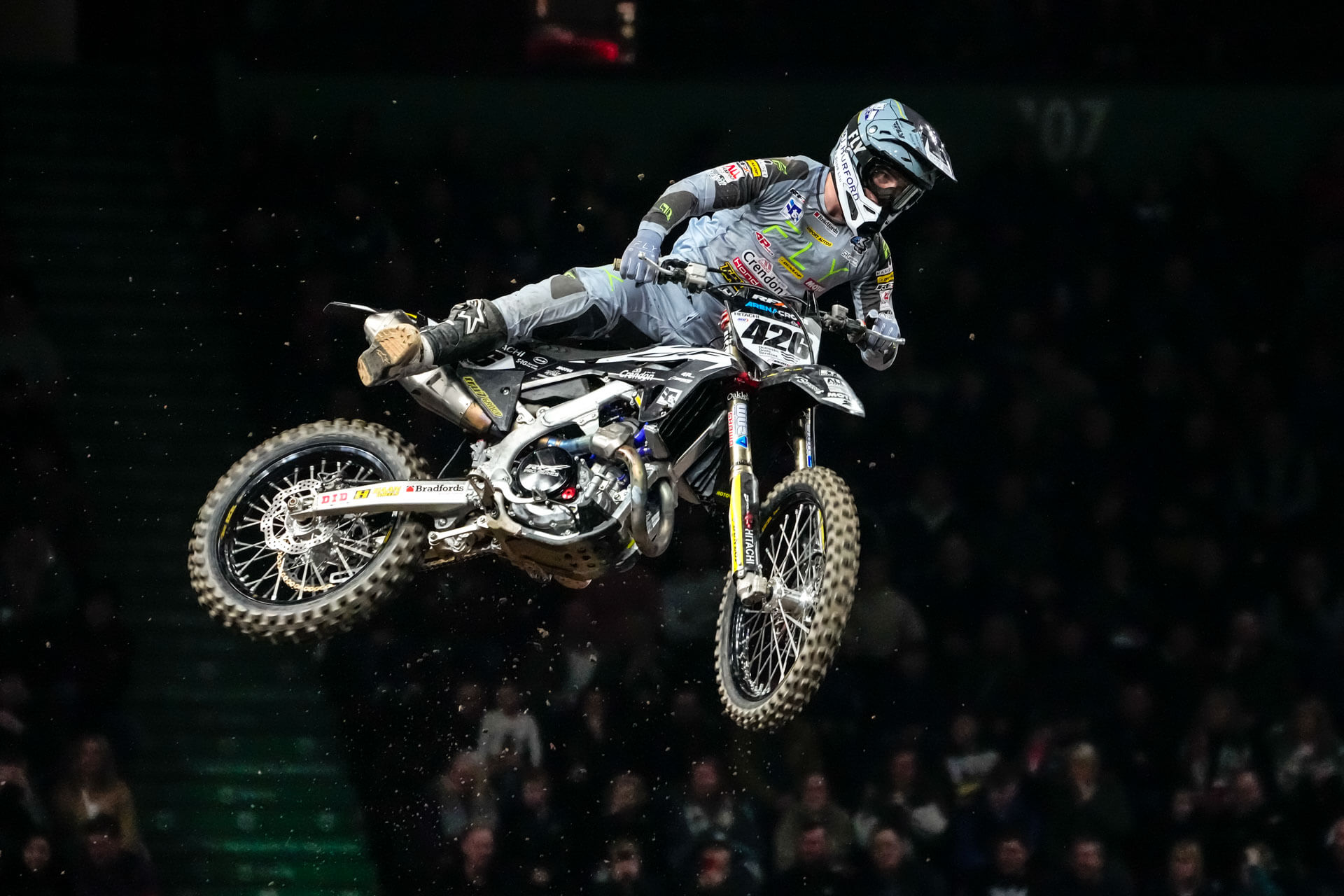 British motocross champ Conrad Mewse showed he will be the man to beat in the UK Arenacross series in the first round of 2024 in Manchester. The Crendon tru7.com Honda rider went quicker than all his rivals in qualifying, setting the fastest lap time in any of the groups. Then in the opening heat showed his true speed by taking a clear win on the new-look Honda CRF450R.