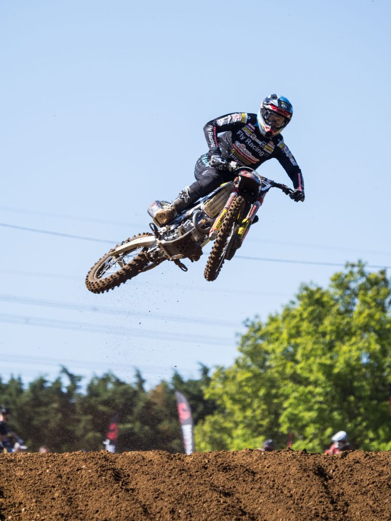MX1 champion Conrad Mewse took his first overall win of the British championship season after inflicting defeat on five-times world champion Jeffrey Herlings at the sandy Blaxhall venue in Suffolk. But it was an event cut short after the first block of racing when three of the four on-site ambulances had to rush to hospital with two injured riders and a spectator thought to be having a heart attack. Without the required emergency cover, the event was abandoned so Mewse’s moto win meant he was the overall winner. And he moved to within three points of red plate holder Herlings in the championship.
