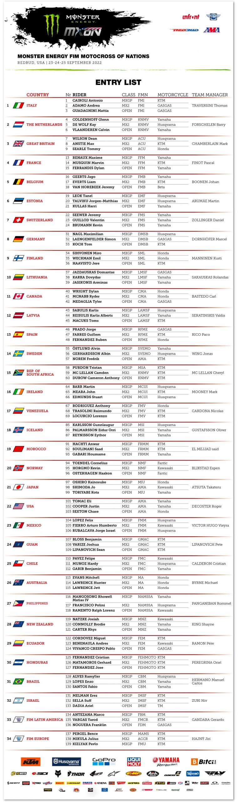 The 2022 Monster Energy FIM Motocross of Nations entry list of the teams that will go head-to-head on September 24th and 25th for the Chamberlain Trophy have been revealed.