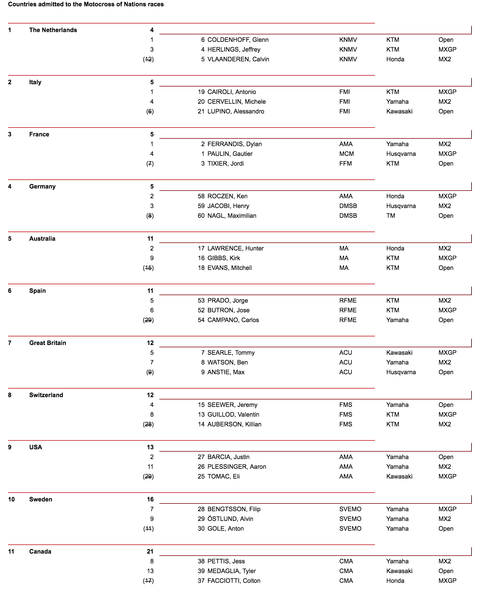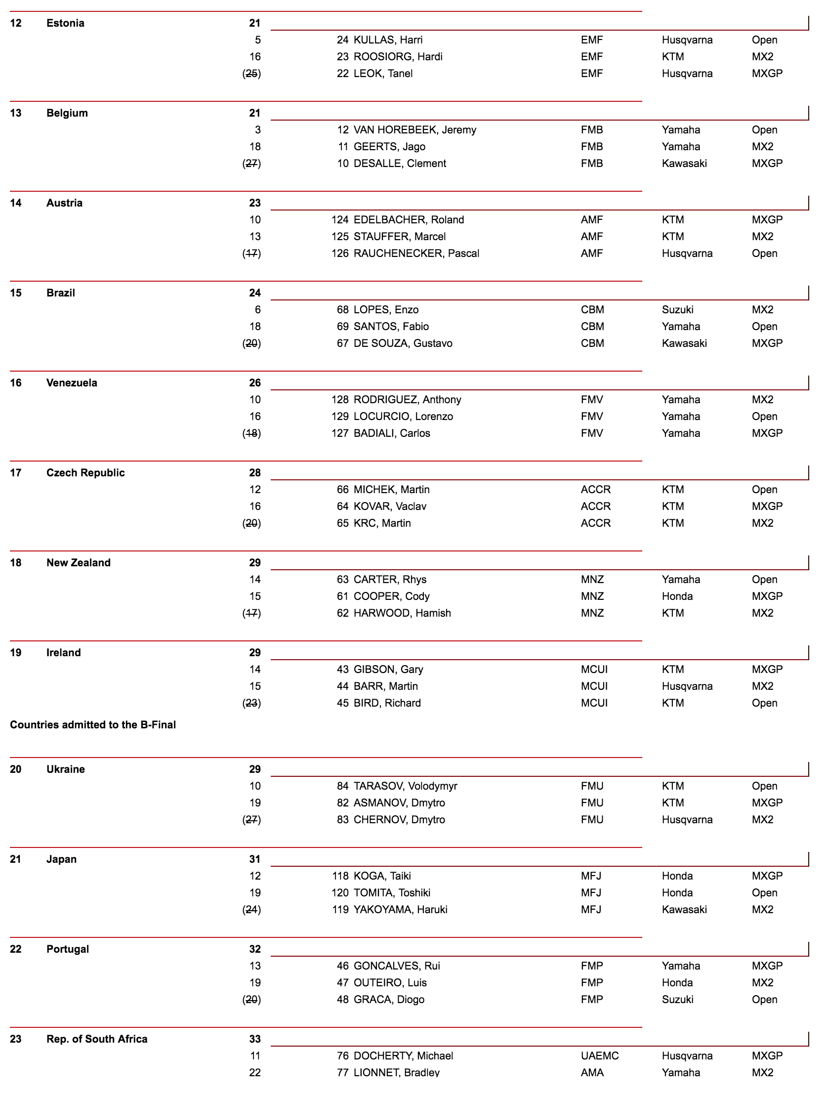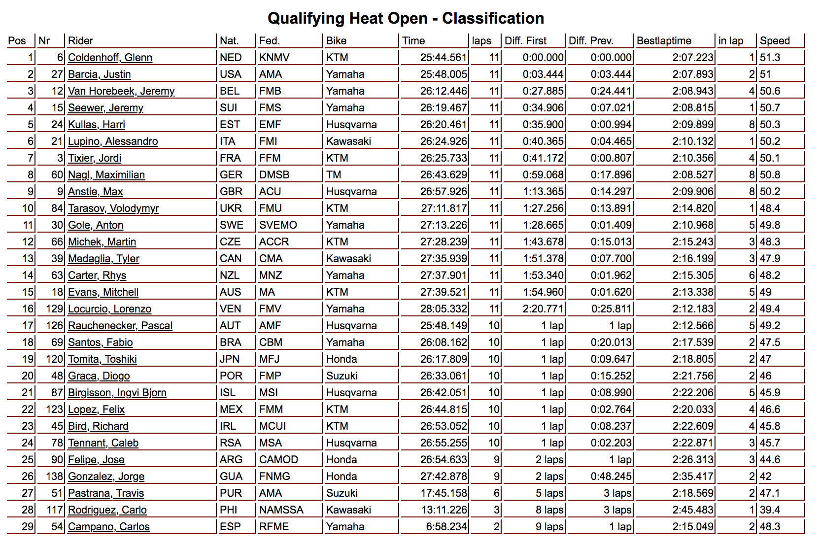 In the final race for Open class bikes, Holland topped Nations qualifying as Glenn Coldenhoff took the win from Justin Barcia who helped the USA to qualify. Belgium also scraped through as Jeremy Van Horebeek was third.
