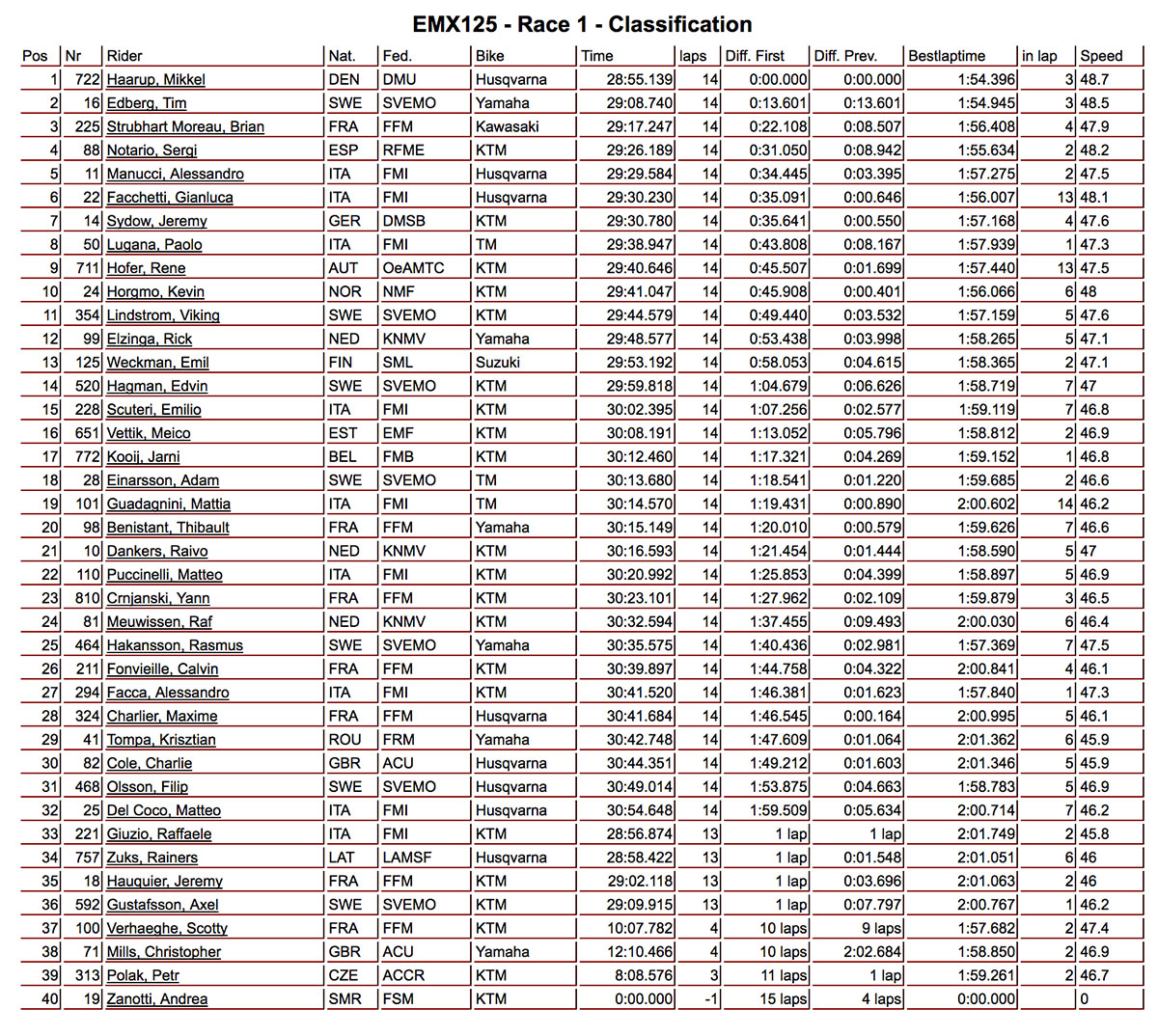 Todd Kellet took 11th place while formerBritish champ Brad Anderson, riding a two-stroke 250 KTM which is now eligible for the EMX class, was 14th.