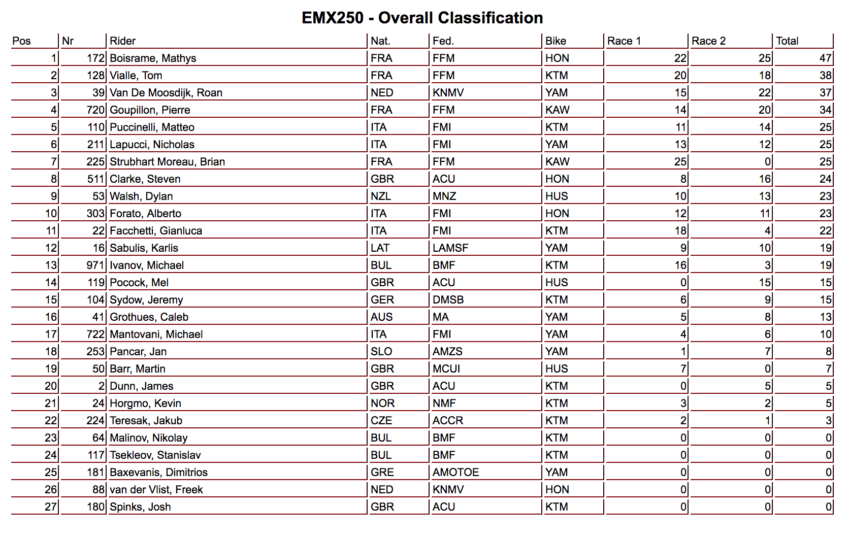 Mel Pocock’s dream of winning both the European EMX250 title and the British MX2 crown have ended after his Euro title rival Mathys Boisrame clinched the EMX250 crown a round early at Sevlievo in Bulgaria today. The Frenchman won overall with a win and a second, and now has a 50 point lead over the Brit, with 50 points still up for grabs in the final round in Italy in September 29. But even if Pocock wins both remaining motos, Boisrame will still have won more so he cannot be caught in the title race.