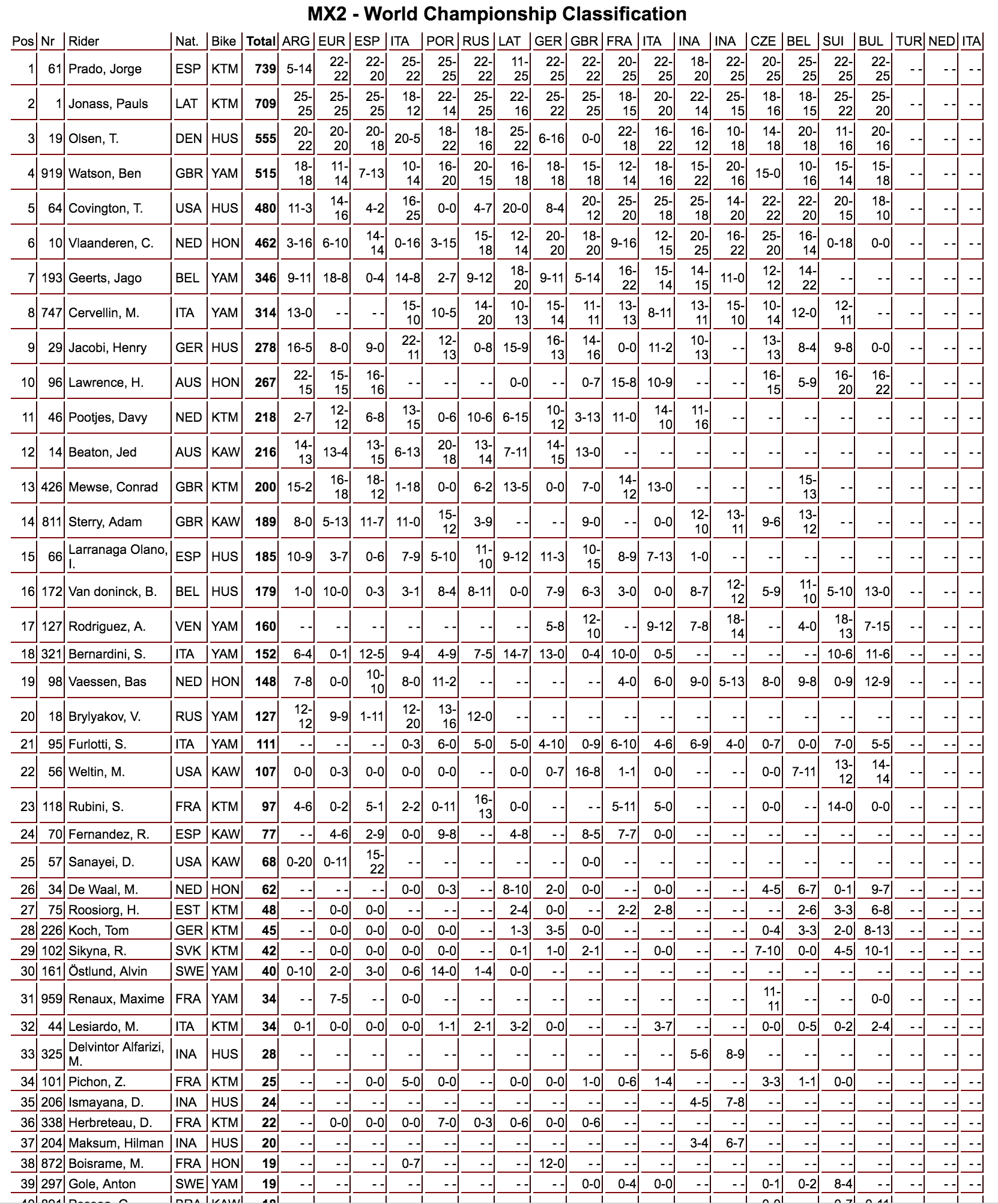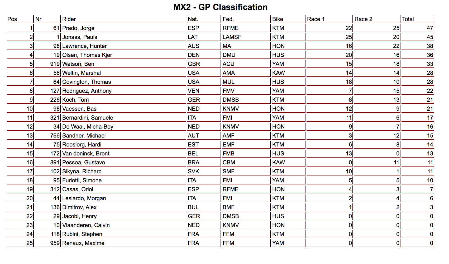 Spaniard Jorge Prado pulled another two points on his rival and current world champ Pauls Jonass in the MX2 world championship. Prado, who has won 13 motos in 2018, took his fifth overall win in a row after Jonass made a slip while chasing him in the second moto. He now leads Jonass by 30 points.