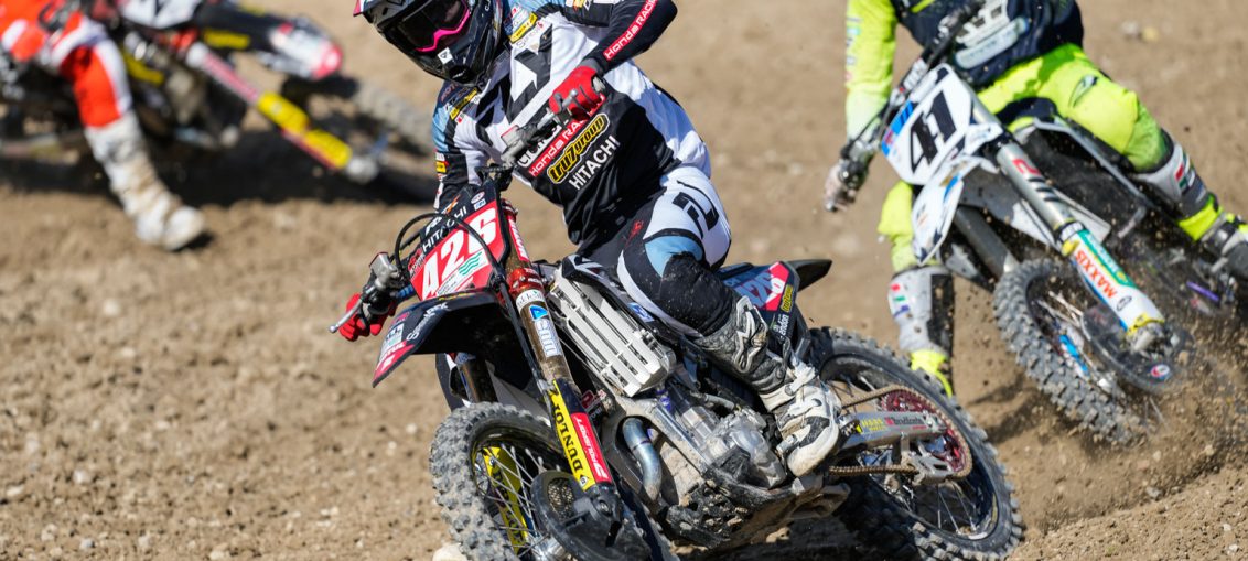 The defending champ and red plate holder is Crendon Tru7 Honda rider Conrad Mewse, a clear winner of both motos in the opener. Even when he thought race one had finished and he pulled off the track with a couple of laps still to go. He had such a big lead he went back out and still won. He loves the sand, and beat Jeffrey Herlings in the sand and mud of Lyng in the British championship opener too. So he’s definitely the favourite, of course.
