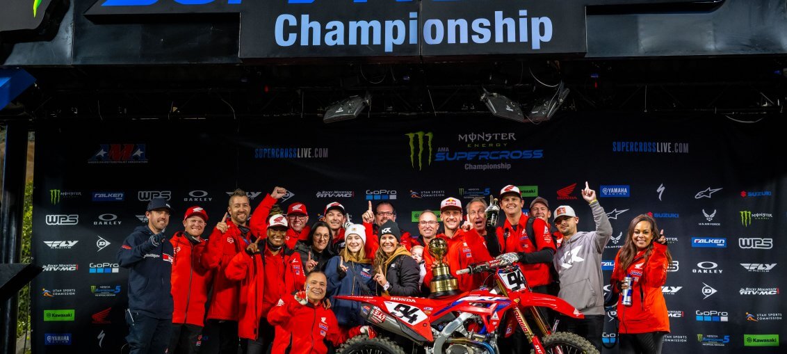 Roczen nailed the premier-class holeshot in the final, while Chase Sexton – fresh off a heat win of his own – tucked in behind him, and the teammates ran nose-to-tail for the first eight laps. At that point, Sexton bobbled on a jump landing and went down, losing one position. The Illinois native quickly remounted and regained the spot, only to crash in the whoops and drop to midpack. During the race’s second half, Sexton charged steadily forward, climbing to fourth by lap 17 of 22, although a last-corner tussle with Marvin Musquin dropped him to fifth. Meanwhile, Roczen crossed the finish line with a margin of over seven seconds on the runner-up rider.
