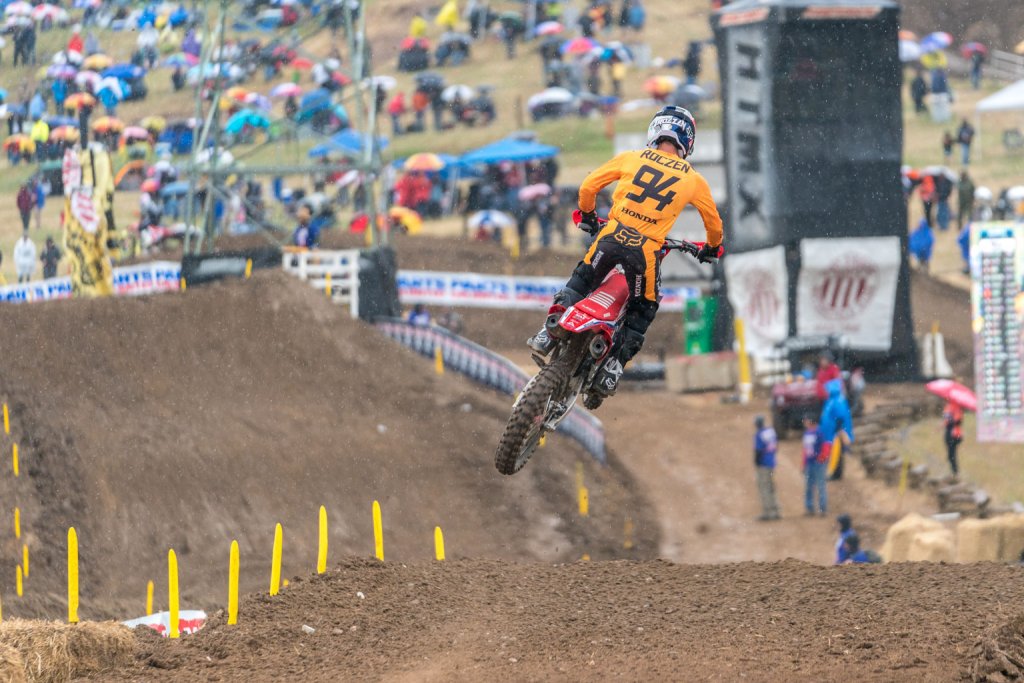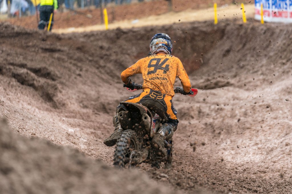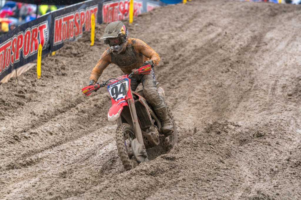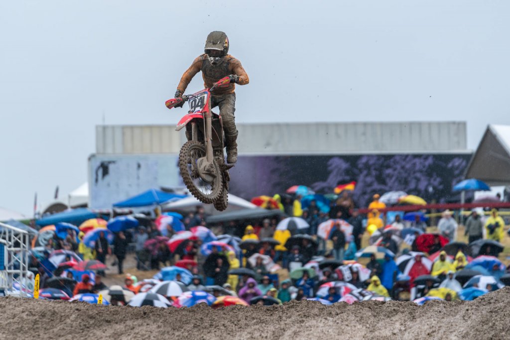 The HRC man Roczen easily won the opening race in perfect track conditions, despite rain starting to fall towards the end of the moto. Second time out it was a mudder. He took the lead early on but had no answer for Eli Tomac who came steaming through.