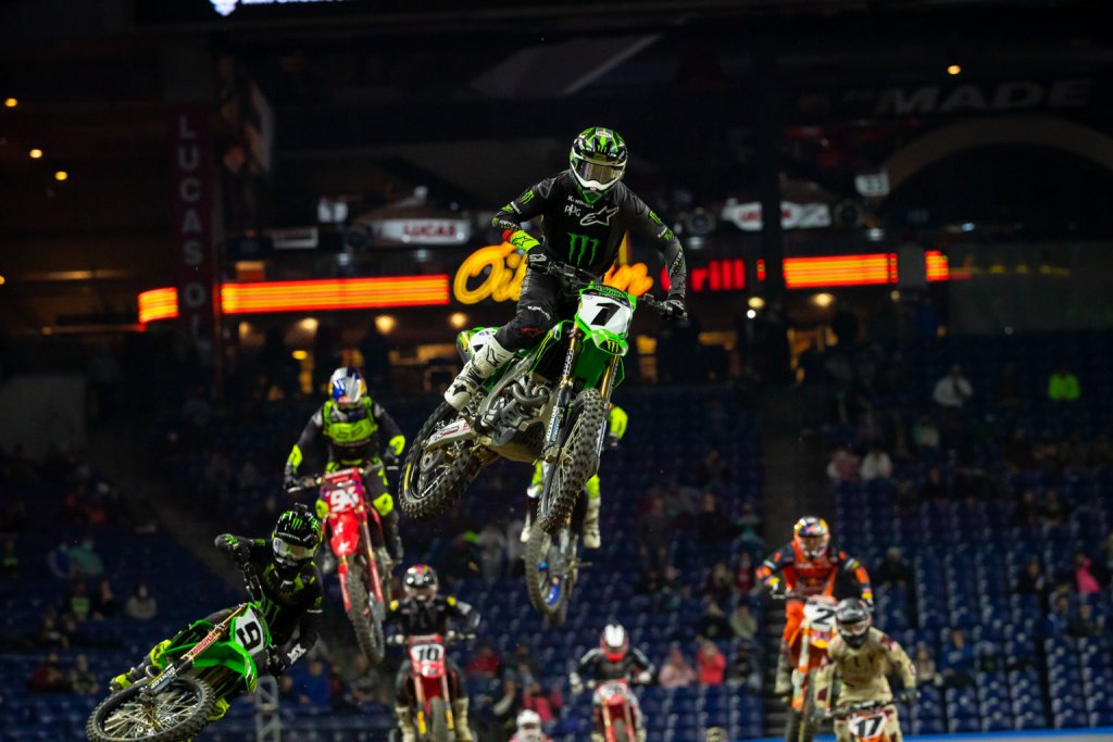 Colt Nichols backed up his Round 3 win in the Eastern Regional 250SX Class by grabbing the holeshot and riding nearly flawlessly to a commanding win. Nichols’ Monster Energy Star Racing Yamaha teammate Christian Craig spent most of the race in second without pressure while Team Honda HRC’s Jett Lawrence recovered from early race trouble; after hitting a false neutral on the start and then stopping to avoid contact with another rider on a wall obstacle that had him backing the bike and remounting, Lawrence looked like he’d have a salvage ride night. But the sophomore Aussie started slicing through the pack. He caught Craig on the final lap, and two corners from the end the riders came together and both went off the track. Jett recovered sooner, but both lost two places just a few dozen yards from the checkers. The return to Indianapolis marks the series’ impressive response to the pandemic shutdowns; last year’s Indy round was the first postponed and re-scheduled to Utah.