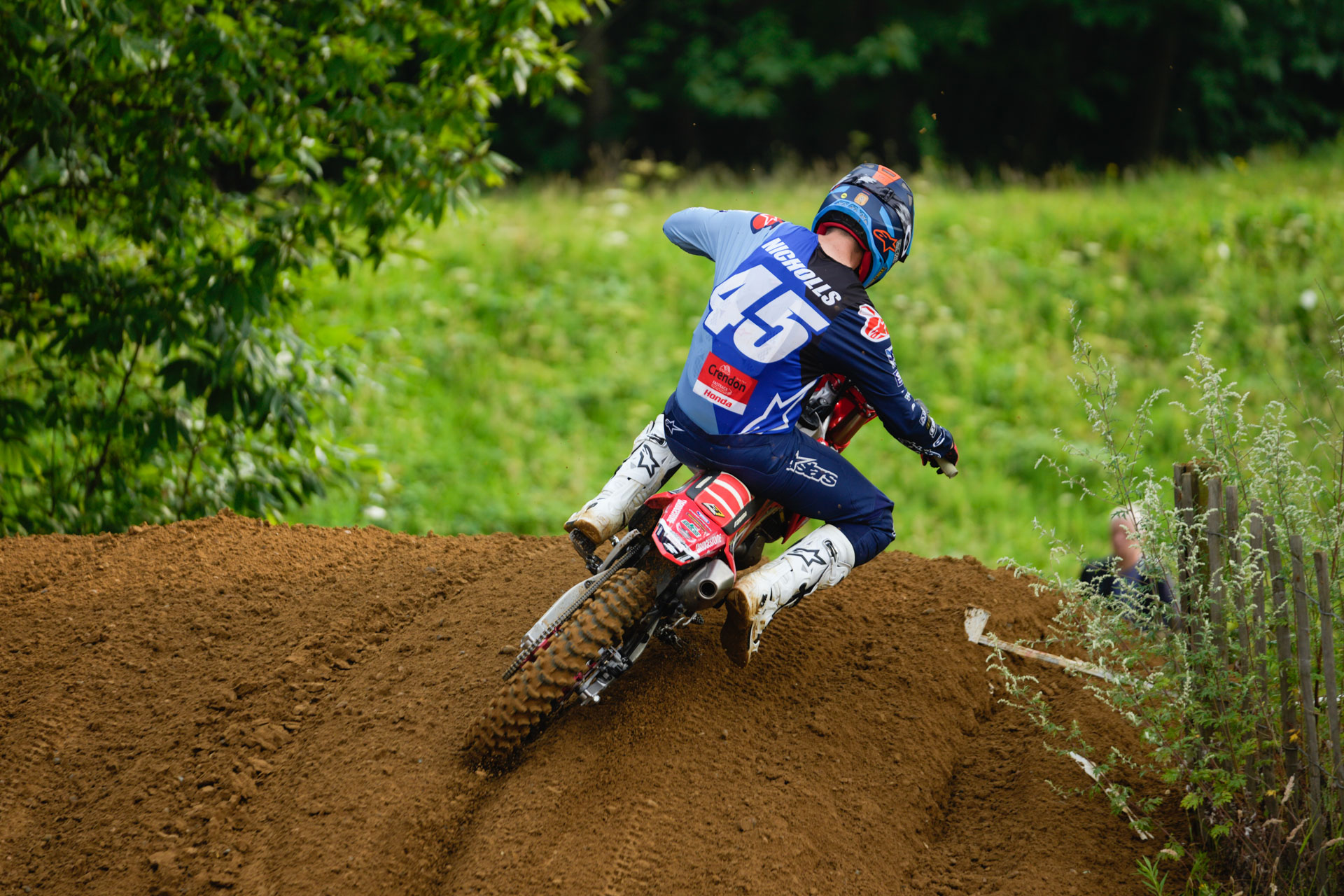 The deciding final moto was in treacherous conditions as rain just before the start turned the hard and bumpy track into a greasy test of nerve. Searle took the holeshot again on his potent Honda CRF450R and led, but wisely didn’t fight back too hard when he was challenged for the lead. He took a calculated third in the race for a clear overall win. And Nicholls, who didn’t get a great start this time, came through the pack in a series of brave overtakes to claim fifth place and a brilliant second overall.
