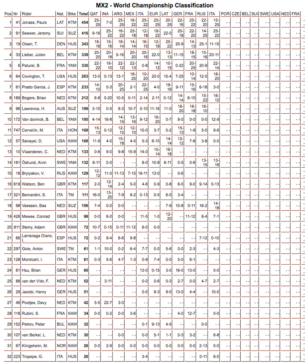 Seewer, who took his third MX2 overall victory this year, said: “In the second race I had the pace in the beginning but had a tough battle with Thomas. I lost so much energy there and I crashed twice so I lost my rhythm there. I was scared I wouldn’t finish as I felt empty. I’m happy to win overall.”