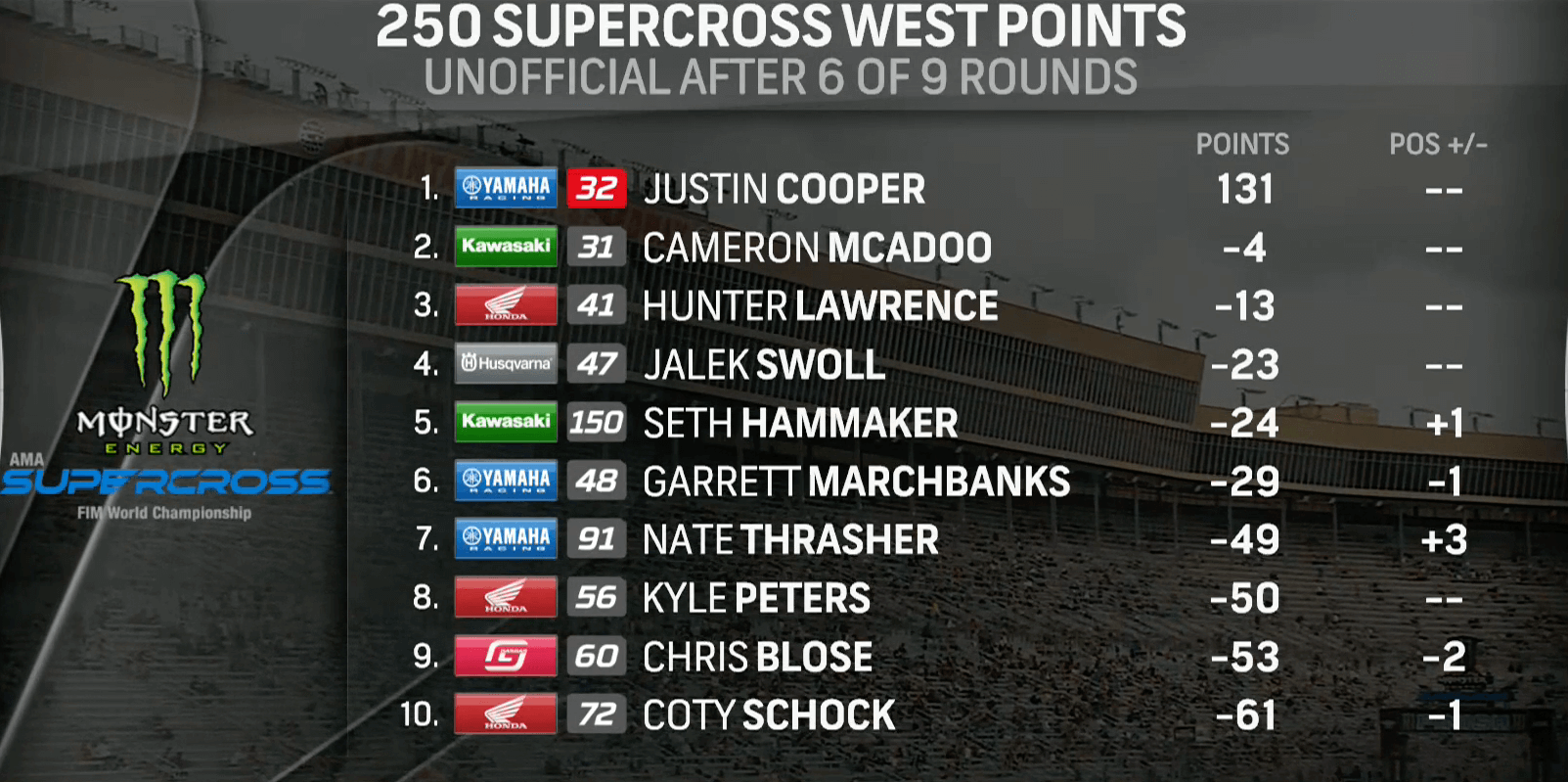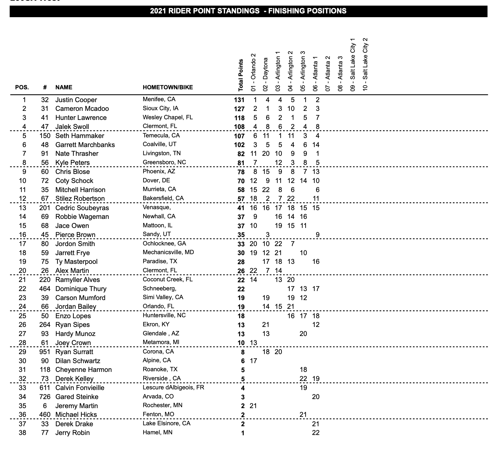 Cooper had a crash in the heat and was shocked at his ride to take second and eke out a small lead over McAdoo. McAdoo, who had a big fall while battling with Hunter Lawrence in his heat, fell while chasing Garrett Marchbanks for second place. McAdoo got back on but had a strong race to get back to third.