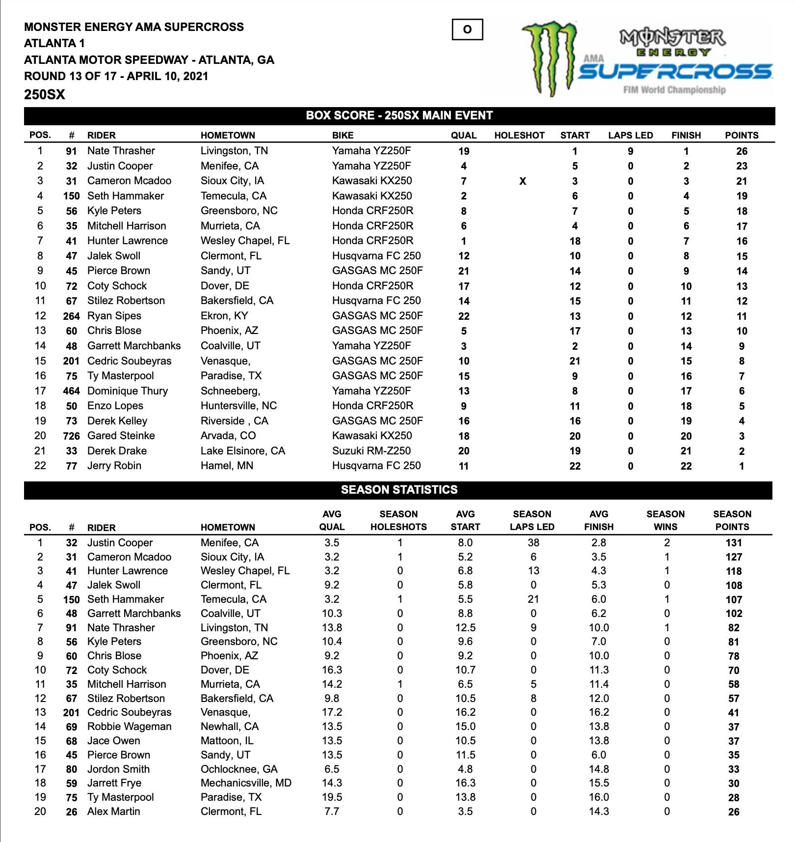 Rookie Nate Thrasher only qualified for the Atlanta SX 250 main event by winning the LCQ, then went on to pull off a shock win the final! The 18-year-old, whose previous best ever was ninth, had a 13 second lead on the last lap as he romped to an easy win from Star Yamaha team-mate and points leader Justin Cooper, from Cameron McAdoo.