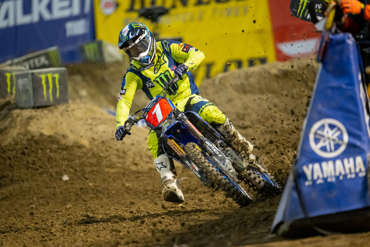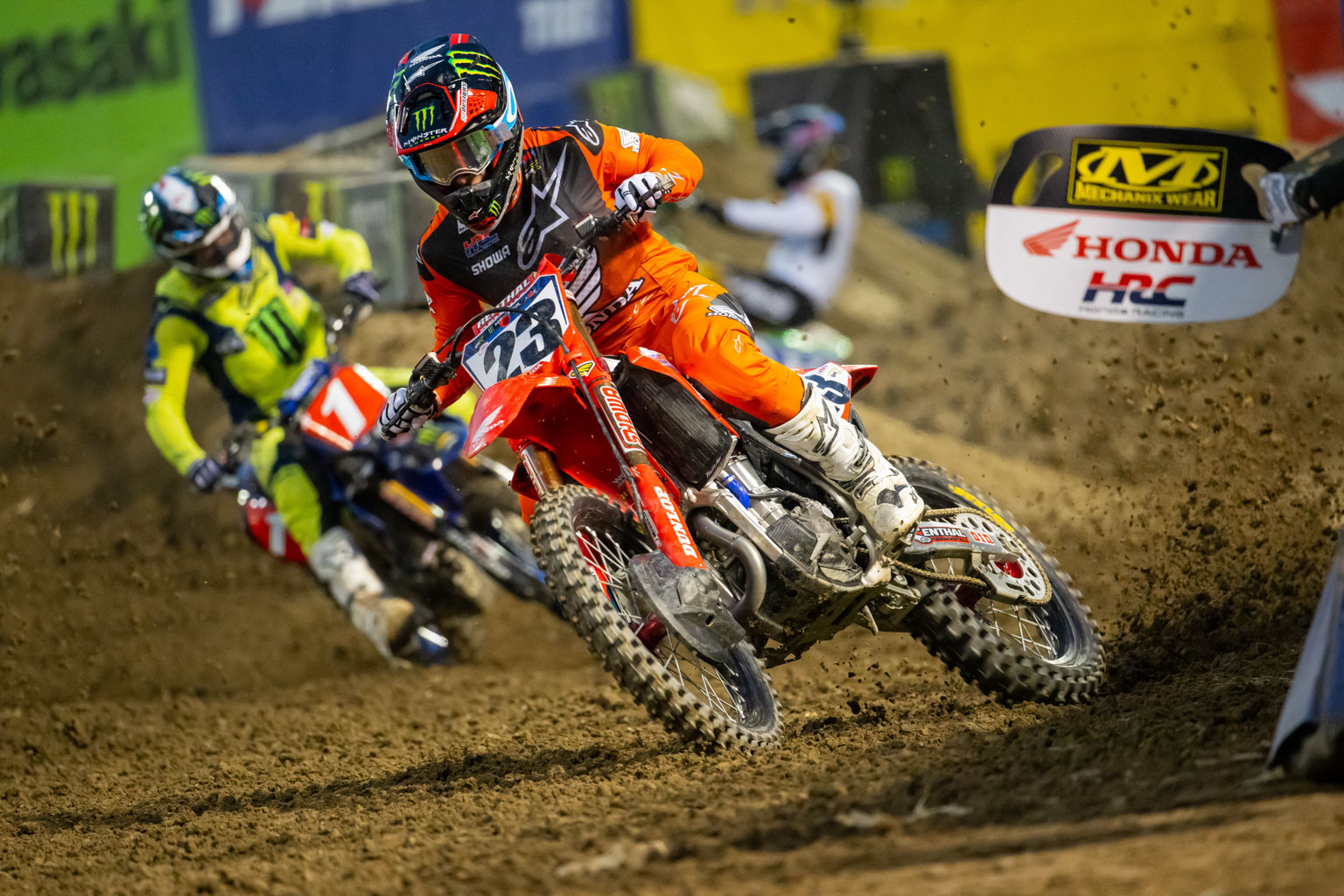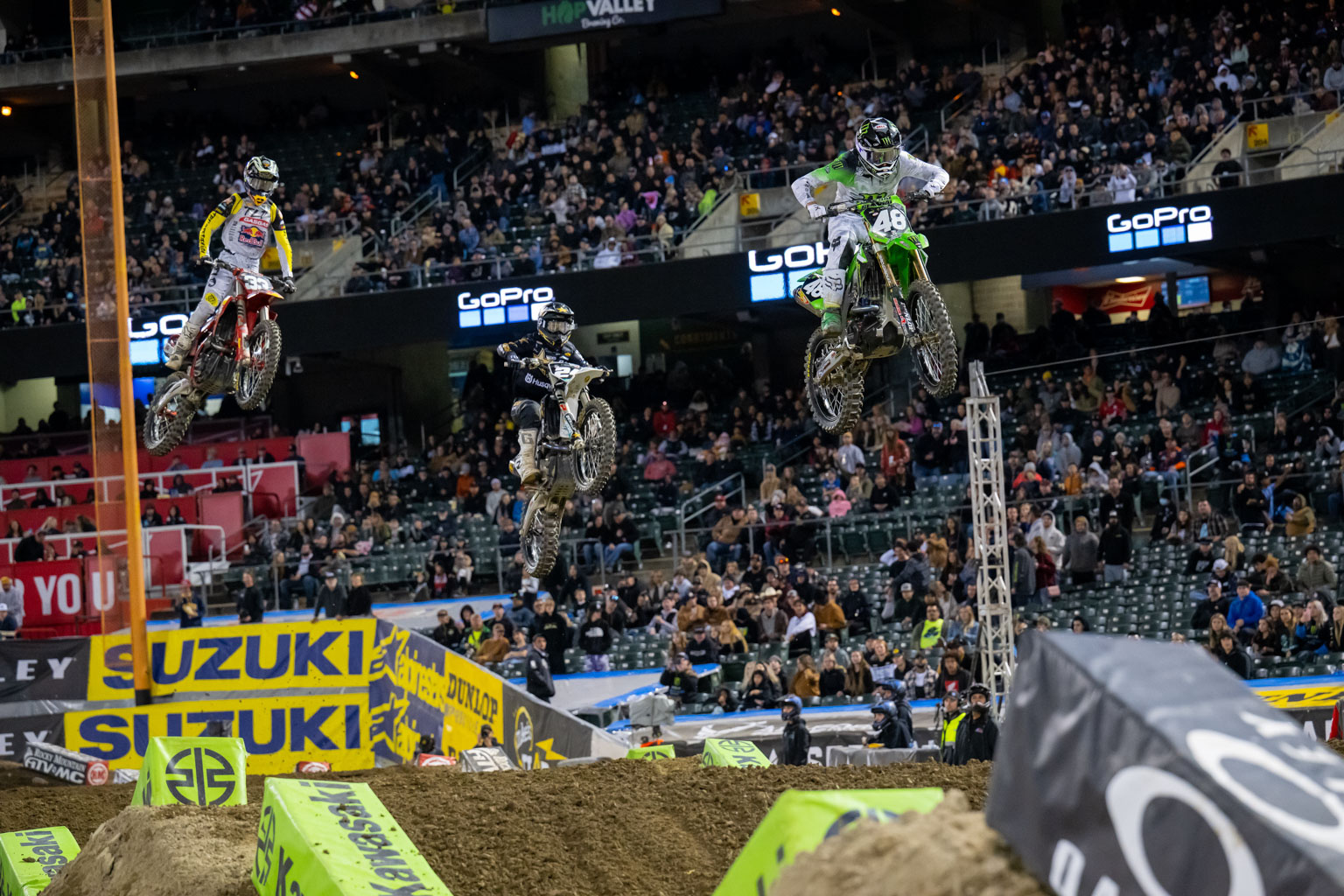 | Tomac wasn’t flawless but he was fast. He took his 48th career Supercross win and stretched his points lead to seven after six races. Photo Credit: Feld Motor Sports, Inc. Chase Sexton grabbed the Holeshot in the 450SX Class Main Event with Rockstar Energy Husqvarna Factory Racing’s Christian Craig, Tomac, Webb, and Red Bull KTM’s Aaron Plessinger following. Webb wasted no time getting into second with Tomac right behind and Progressive Insurance ECSTAR Suzuki’s Ken Roczen jumping into fourth. As the top three began to distance themselves from the pack, Monster Energy Kawasaki’s Jason Anderson took over fourth place. Five minutes into the 20-minute plus one lap race Sexton held a 2.2 second lead over Tomac, who’d gapped Webb by four seconds. The front three ran that formation for several laps. Behind them Plessinger put his KTM into fourth place and Roczen, Anderson, and Troy Lee Designs Red Bull GASGAS Factory Racing’s Justin Barcia scrapped for fifth. Up front, Sexton slowly stretched out his lead past five seconds. A near-crash may have gotten into Sexton’s head and led to an actual crash; with just over six and a half minutes left on the race clock he slipped sideways off a small single and crashed into a corner marker. Tomac took over the lead while Sexton remounted in second place. But Sexton’s troubles weren’t over. Webb was on the move, and with 48 seconds left on the race clock Webb used a unique line down the track’s final rhythm section to get past Sexton. When the riders took the white flag, Webb was 4.3 seconds behind Tomac. Then it was Tomac’s turn to make an unforced error. On the final lap he landed awkwardly into the face of a small jump, got off-balance, and veered off the track. Tomac recovered but looked off-time for the final lap while Webb laid down a fierce charge. Webb had his fast line in the rhythm section that Tomac wasn’t doing, and as the two riders approached the final turn Webb’s faster line came up just short giving him the pass. Tomac took the win less than a second ahead of Webb. Tomac’s win was his 48th Supercross victory, putting him into a tie for third-most all-time wins with Ricky Carmichael, who called the race from the announcer’s booth. |