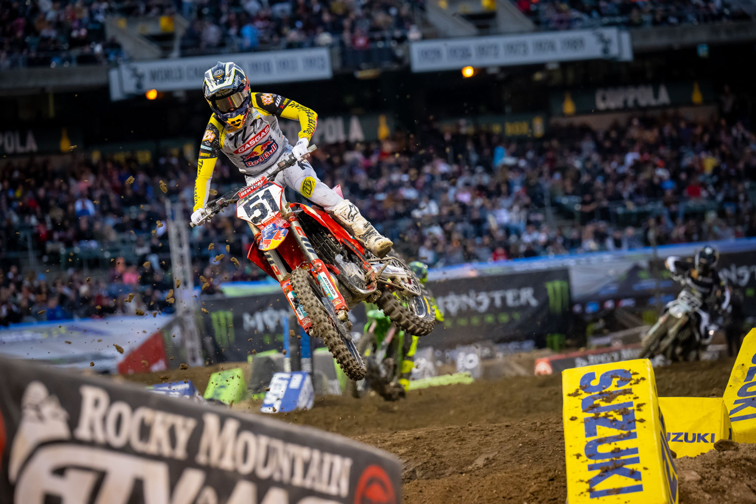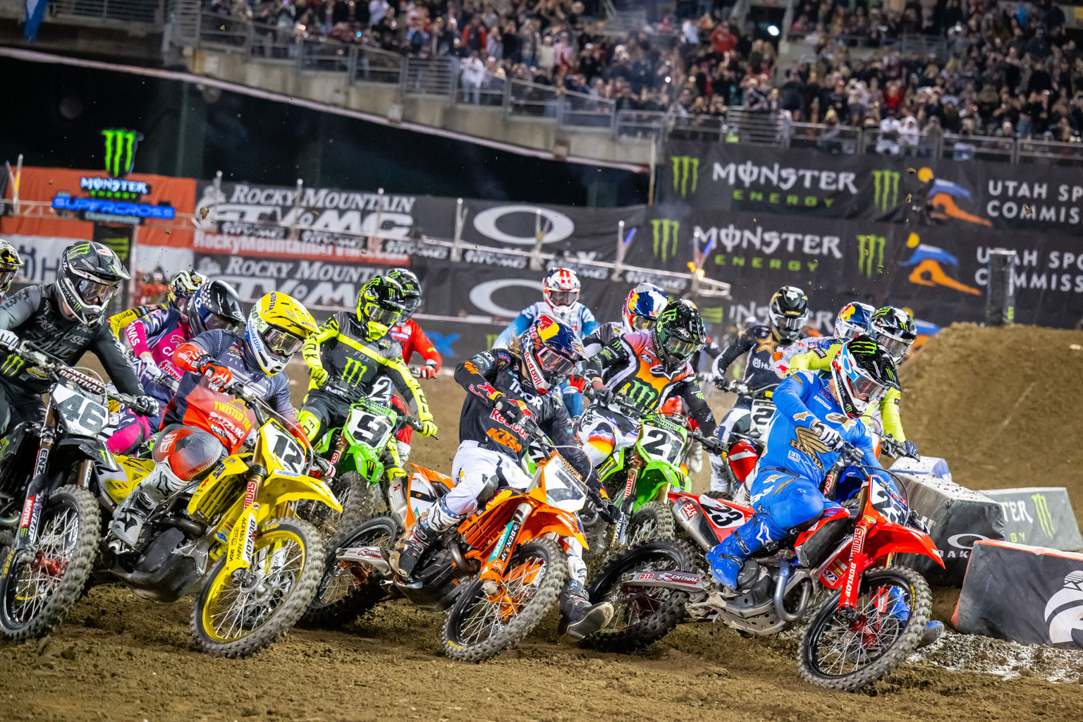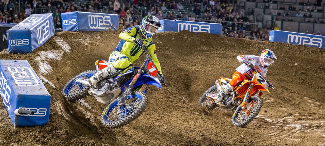 | Tomac wasn’t flawless but he was fast. He took his 48th career Supercross win and stretched his points lead to seven after six races. Photo Credit: Feld Motor Sports, Inc. Chase Sexton grabbed the Holeshot in the 450SX Class Main Event with Rockstar Energy Husqvarna Factory Racing’s Christian Craig, Tomac, Webb, and Red Bull KTM’s Aaron Plessinger following. Webb wasted no time getting into second with Tomac right behind and Progressive Insurance ECSTAR Suzuki’s Ken Roczen jumping into fourth. As the top three began to distance themselves from the pack, Monster Energy Kawasaki’s Jason Anderson took over fourth place. Five minutes into the 20-minute plus one lap race Sexton held a 2.2 second lead over Tomac, who’d gapped Webb by four seconds. The front three ran that formation for several laps. Behind them Plessinger put his KTM into fourth place and Roczen, Anderson, and Troy Lee Designs Red Bull GASGAS Factory Racing’s Justin Barcia scrapped for fifth. Up front, Sexton slowly stretched out his lead past five seconds. A near-crash may have gotten into Sexton’s head and led to an actual crash; with just over six and a half minutes left on the race clock he slipped sideways off a small single and crashed into a corner marker. Tomac took over the lead while Sexton remounted in second place. But Sexton’s troubles weren’t over. Webb was on the move, and with 48 seconds left on the race clock Webb used a unique line down the track’s final rhythm section to get past Sexton. When the riders took the white flag, Webb was 4.3 seconds behind Tomac. Then it was Tomac’s turn to make an unforced error. On the final lap he landed awkwardly into the face of a small jump, got off-balance, and veered off the track. Tomac recovered but looked off-time for the final lap while Webb laid down a fierce charge. Webb had his fast line in the rhythm section that Tomac wasn’t doing, and as the two riders approached the final turn Webb’s faster line came up just short giving him the pass. Tomac took the win less than a second ahead of Webb. Tomac’s win was his 48th Supercross victory, putting him into a tie for third-most all-time wins with Ricky Carmichael, who called the race from the announcer’s booth. |